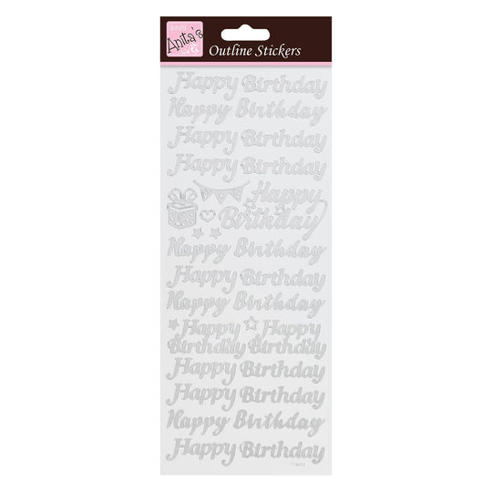 Anita's Outline Stickers, Happy Birthday, Silver on White, For Scrapbooking, Card Making, Kids Play, Homework, Art, Craft, Embelish, Decorative, Paper, Card, Glass, Metal, Plastic, Foam