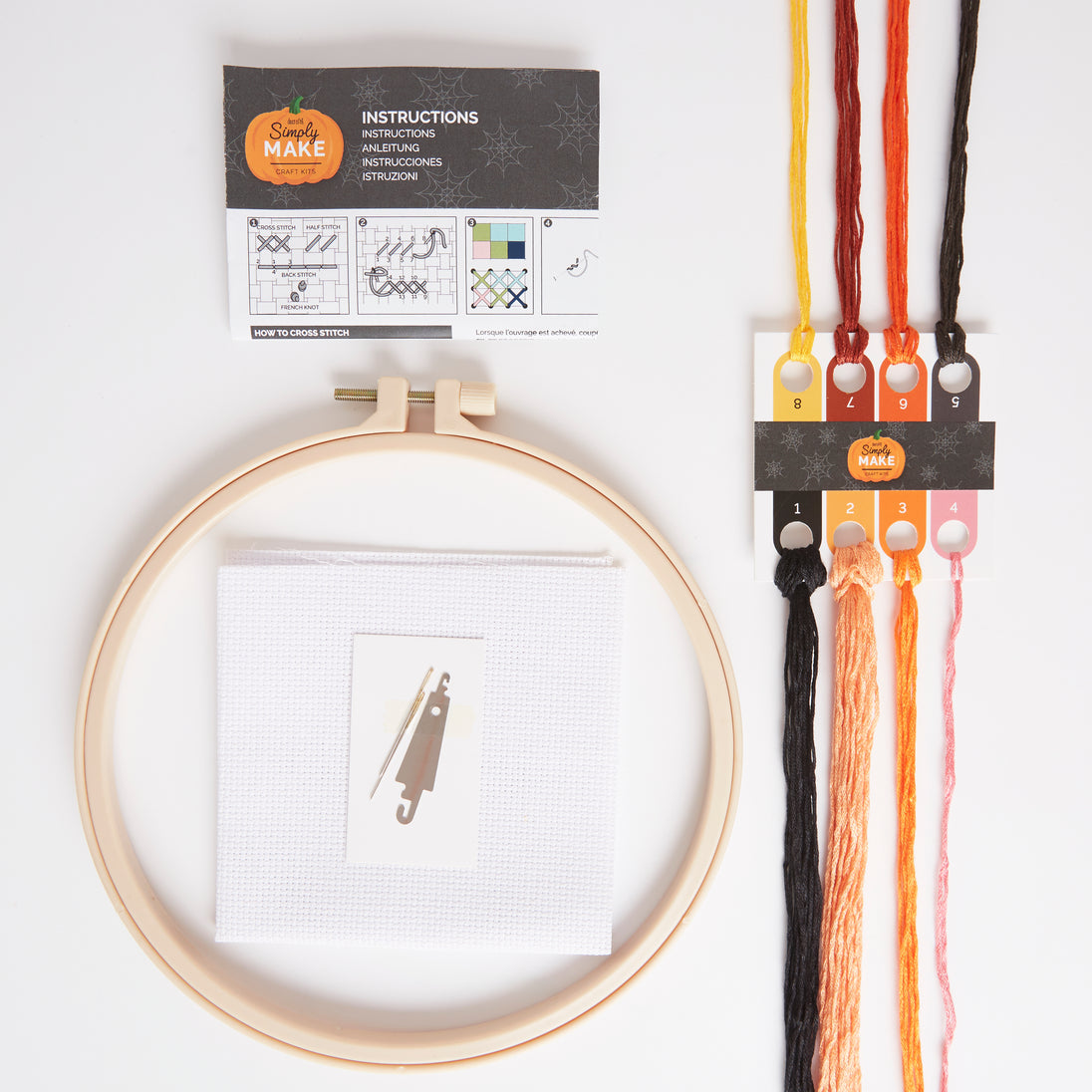 Simply Make Cross Stitch Kit Cat & Pumpkin Design Halloween, Hoop, Embroidery Thread, Fabric & Needle, For Beginners, Starter Cross Stitch Craft Kit, Great Gifts, Craft Hobbyists, Halloween Home Décor
