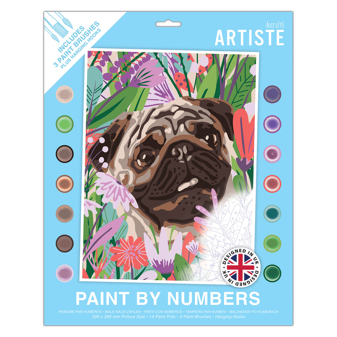 Artiste Large Paint By Numbers, Floral Pug, Animal Painting Craft, 395x295mm Board 14 Acrylic Colour Paint 3 Size Brush Set, Adults Craft, Hobbies Craft, Number Coded Design, Personalised Art