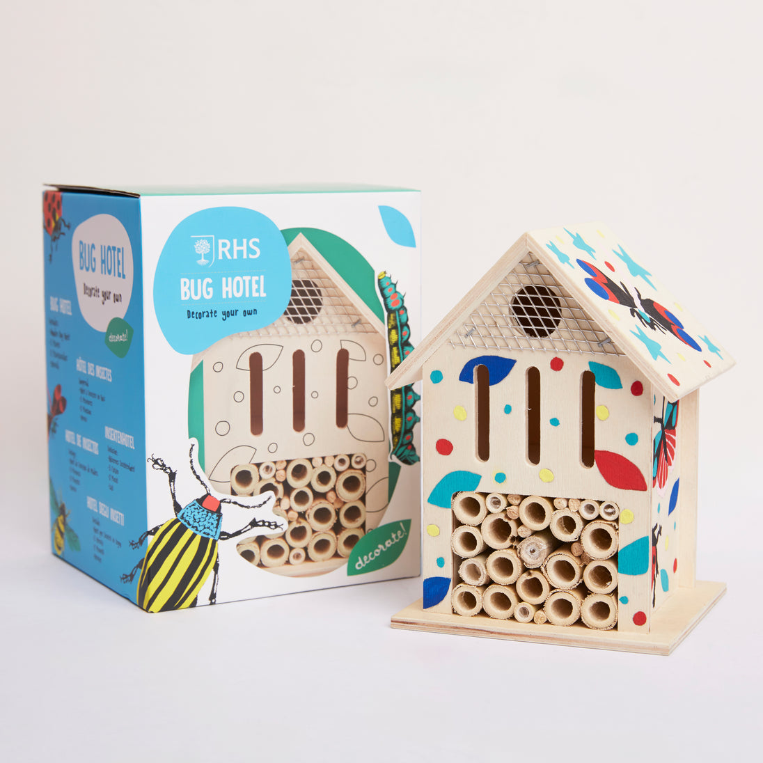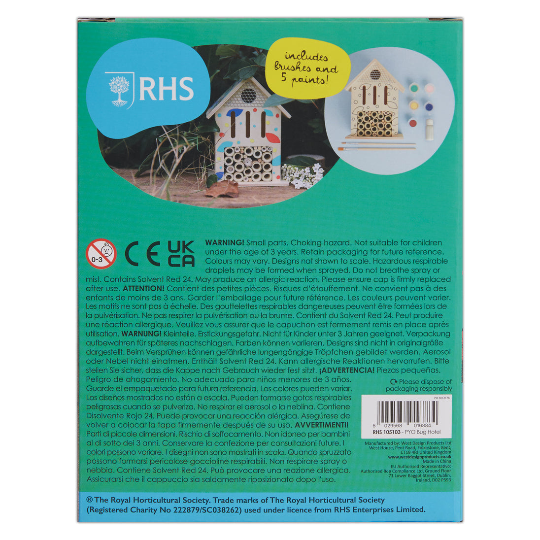 RHS The Royal Horticultural Society Paint Your Own Set With 5 Paints, Brush, Varnish & Instructions, Bug Hotel, White, Includes Paints, Brush & Guide, Blank Bug Hotel With Outlines