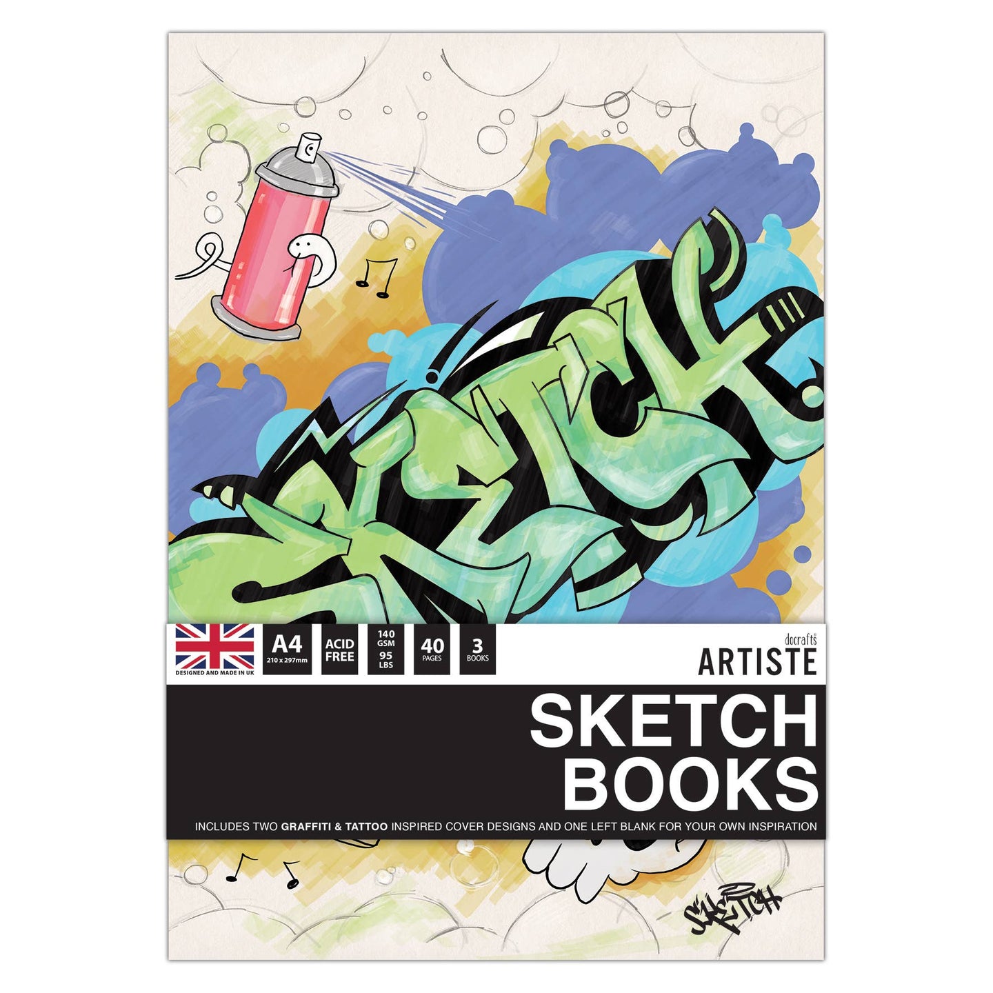 Artiste A4 Sketchbooks - Graffiti Tattoo Notebooks - Pack of 3 For Drawing, Sketching, Doodling, Writing And Scrapbook Designs With Mixed Media, Pen, Ink, Painting And More