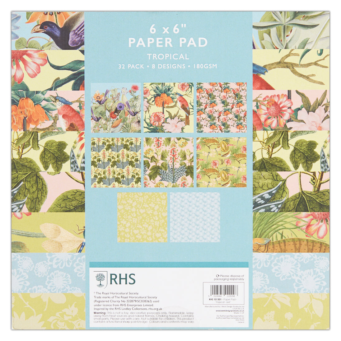 RHS The Royal Horticultural Society Paper Pad, 180GSM, 8 Designs, Tropical, 6x6", 32 Sheets, Craft Drawing Pad Book for Card Making, Sketch Book Projects, Scrapbook Paper Pad, Beautiful Art Paper