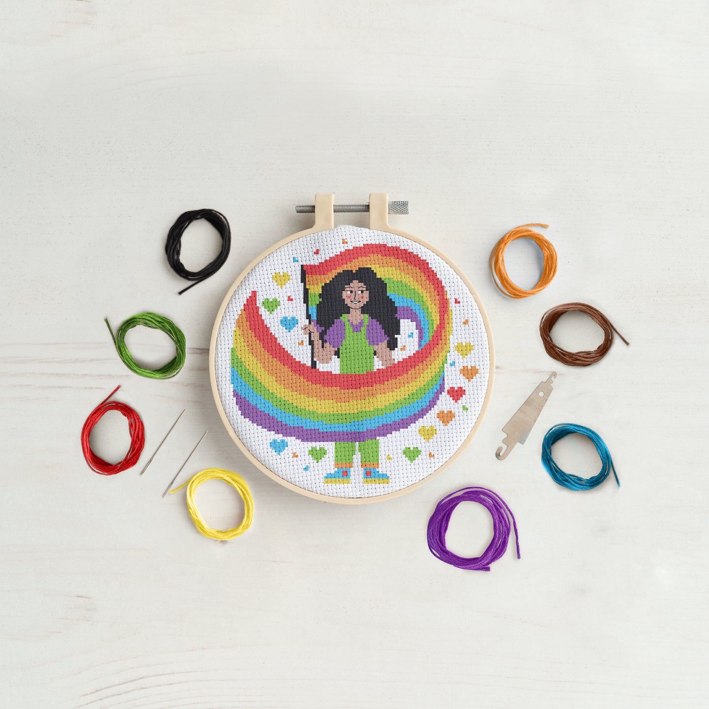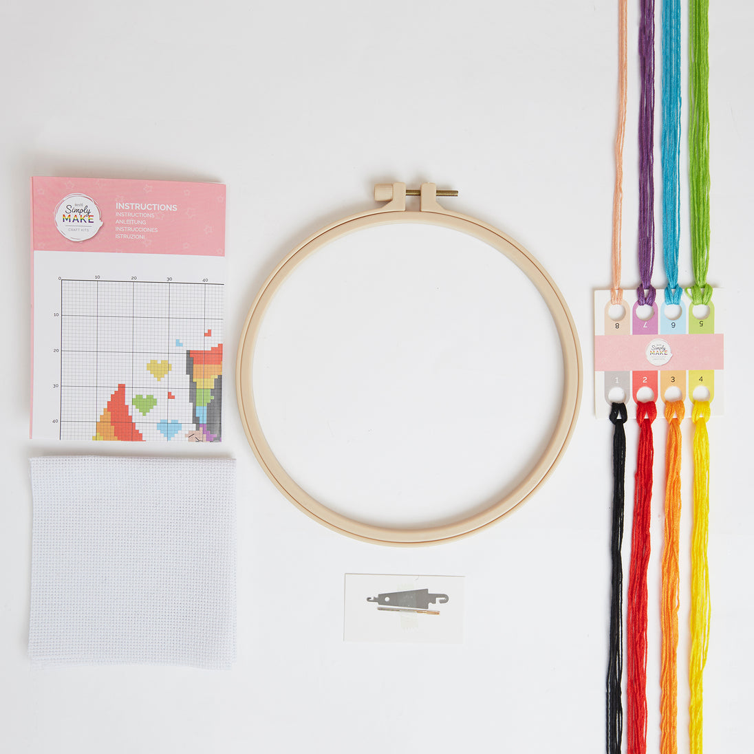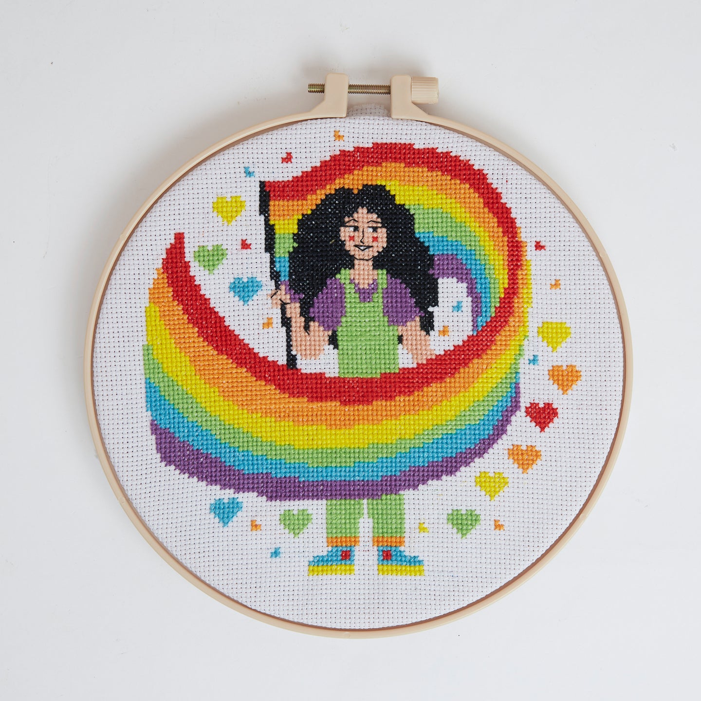 This kit contains everything that you need to create a great finished project in a Rainbow Flag design. Includes instruction and cross stitch chart,200mm plastic hoop, up to 8 x threads,aida fabric, 2 x needles, and threader.
