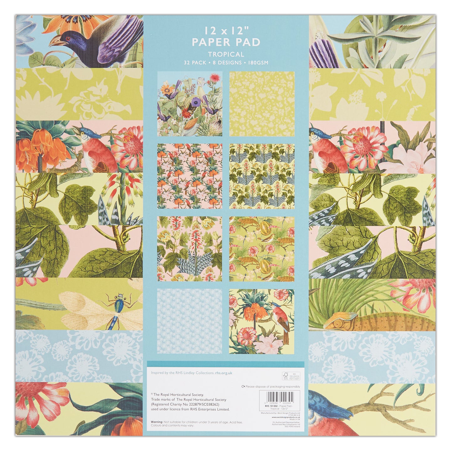 RHS Paper Pad, 180 GSM, 8 Tropical Designs, 12" x 12", 32 Sheets, Premium Patterned Paper, For Cardmaking, Scrapbooking, Decoupage