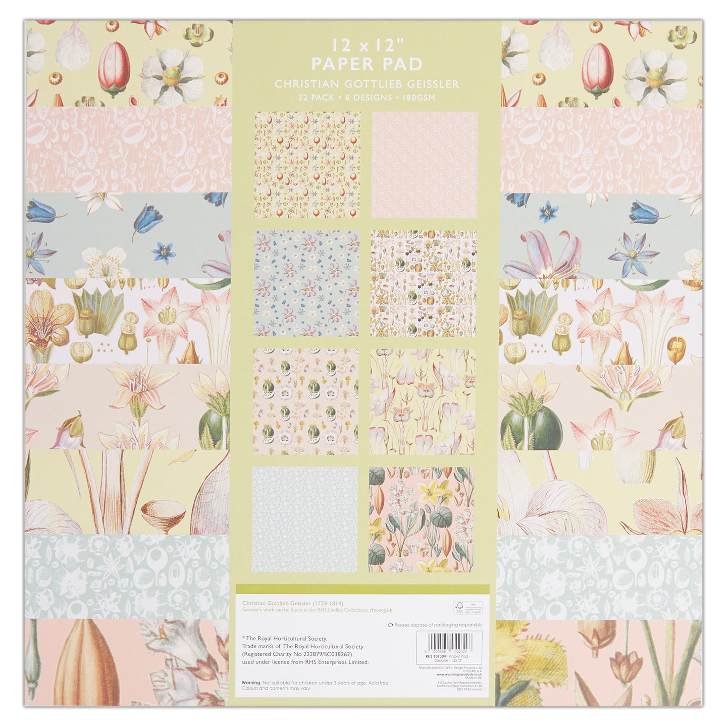 RHS Paper Pad, 180 GSM, 8 Geissler Designs, 12" x 12", 32 Sheets, Premium Patterned Paper, For Cardmaking, Scrapbooking, Decoupage