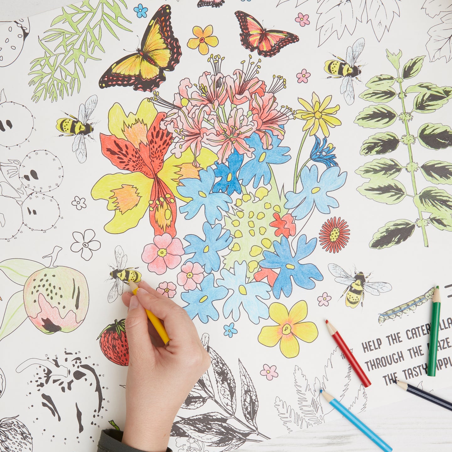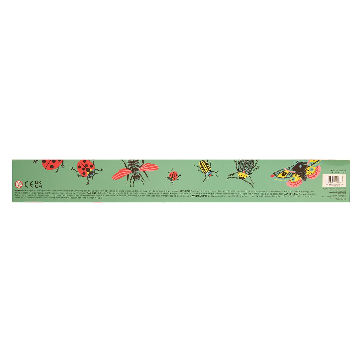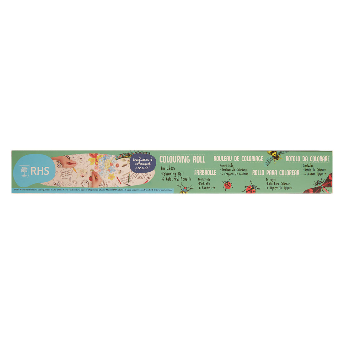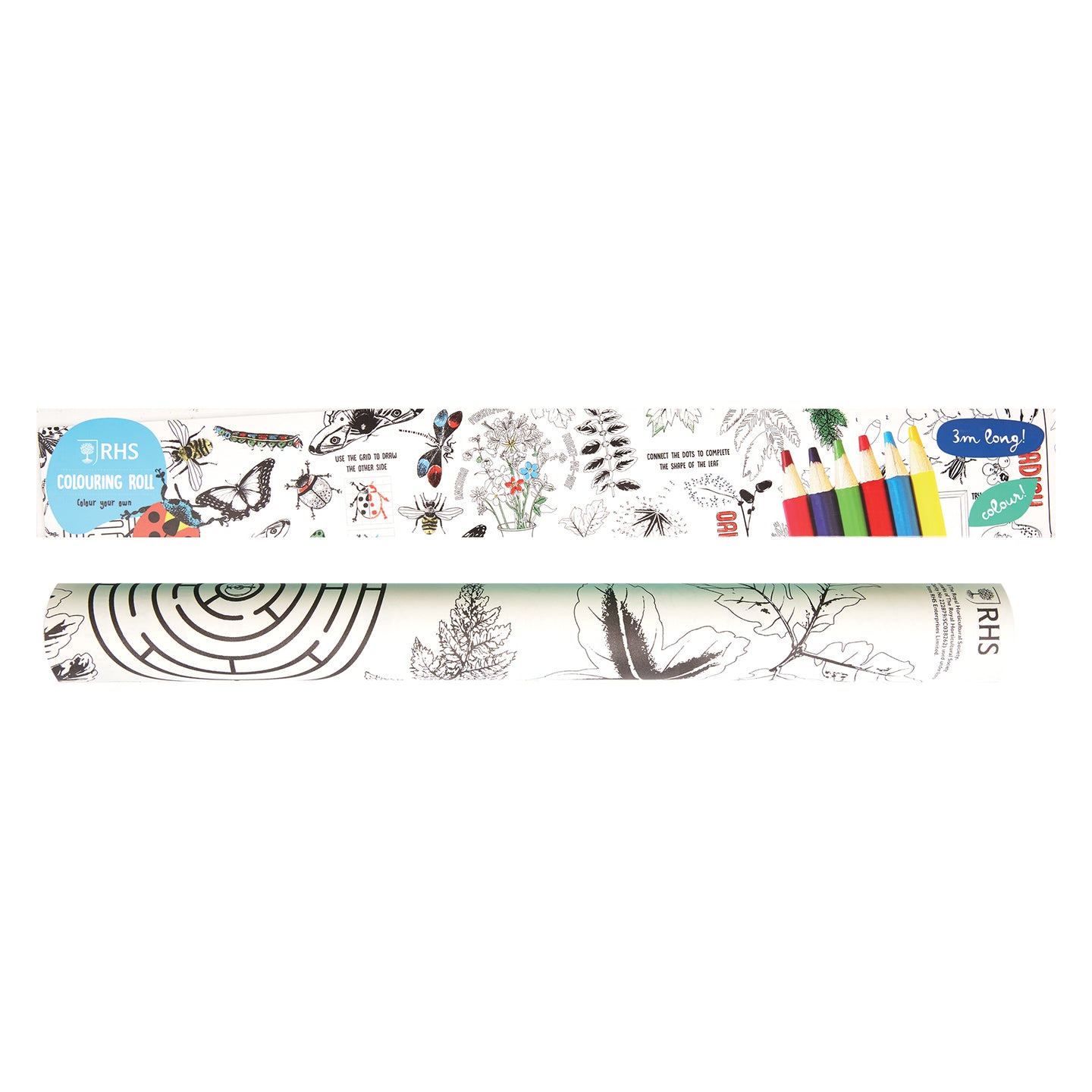 RHS The Royal Horticultural Society Colouring Roll & Pencils, Bugs and Blooms Design, 3 Meters, White, Kids Activity, Play & Learn, Hours Of Fun, Summer Holidays Idea, Colour In Book Alternative
