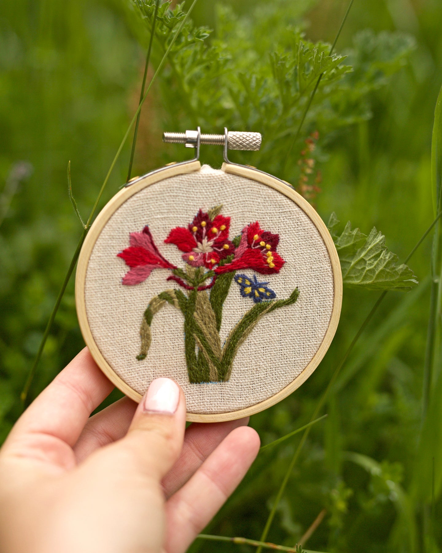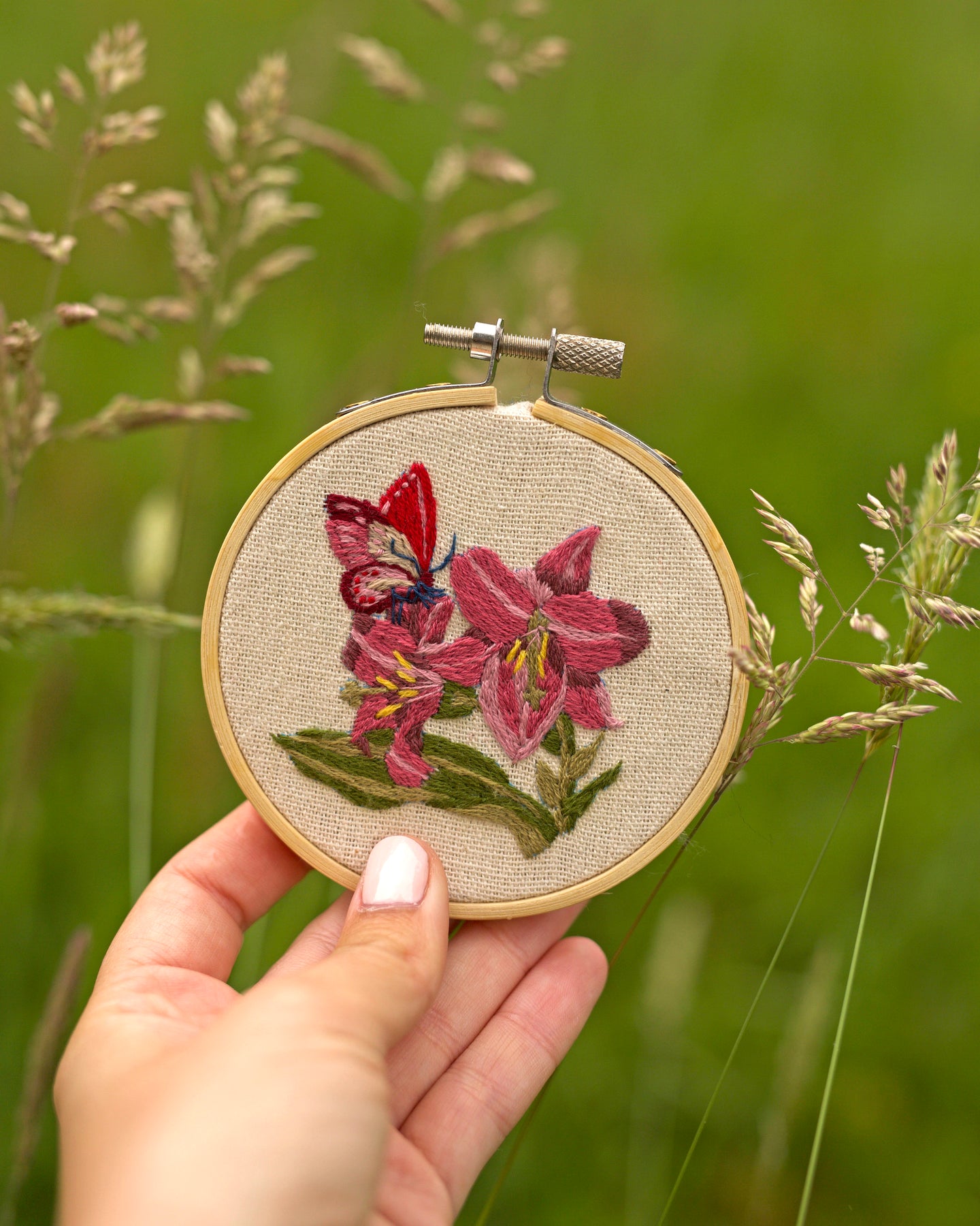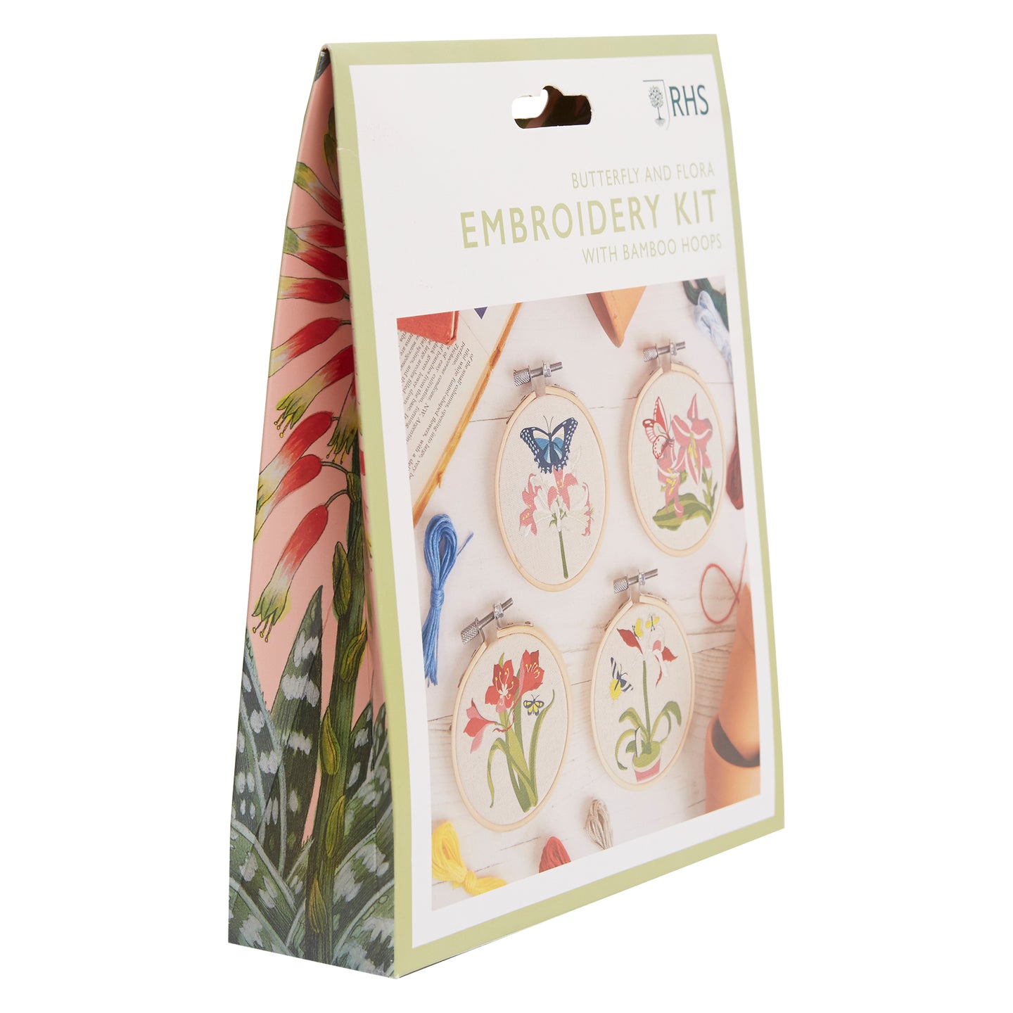 RHS The Royal Horticultural Society Embroidery Hoop Decoration Kit, Butterfly and Flora, Pack Of 4, Includes Bamboo Embroidery Hoop, Printed Fabric, Embroidery Threads, Needles, Threader, Instructions