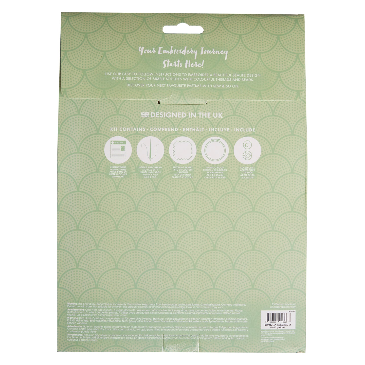 Premium Sew and So On kits are perfect for beginners or experienced sewers alike. This kit includes everything required to complete a stylish Making Waves embroidery design that can be displayed in the bamboo hoop included.