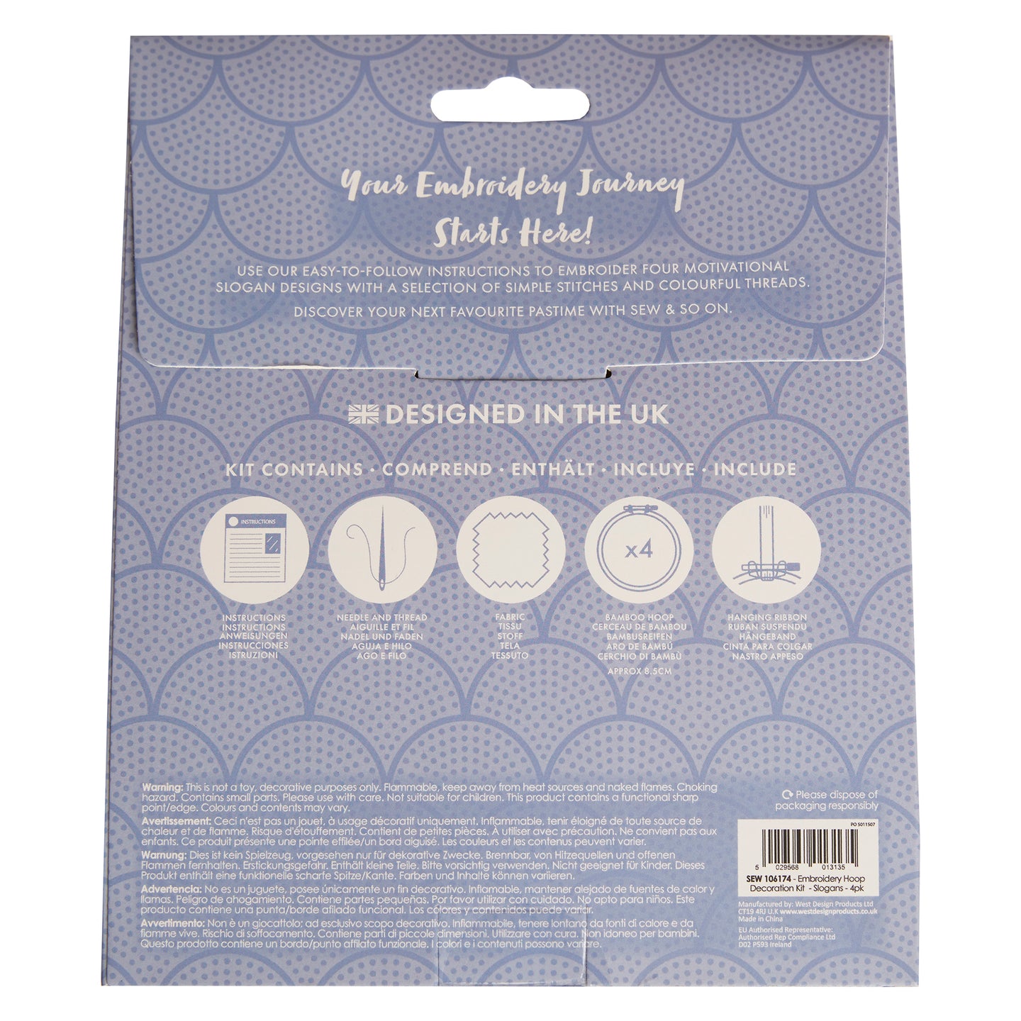 Premium Sew and So On kits are perfect for beginners or experienced sewers alike. This kit includes everything required to complete a set of 4 stylish embroidery designs in a fun Slogans theme that you can display in the bamboo hoops included.