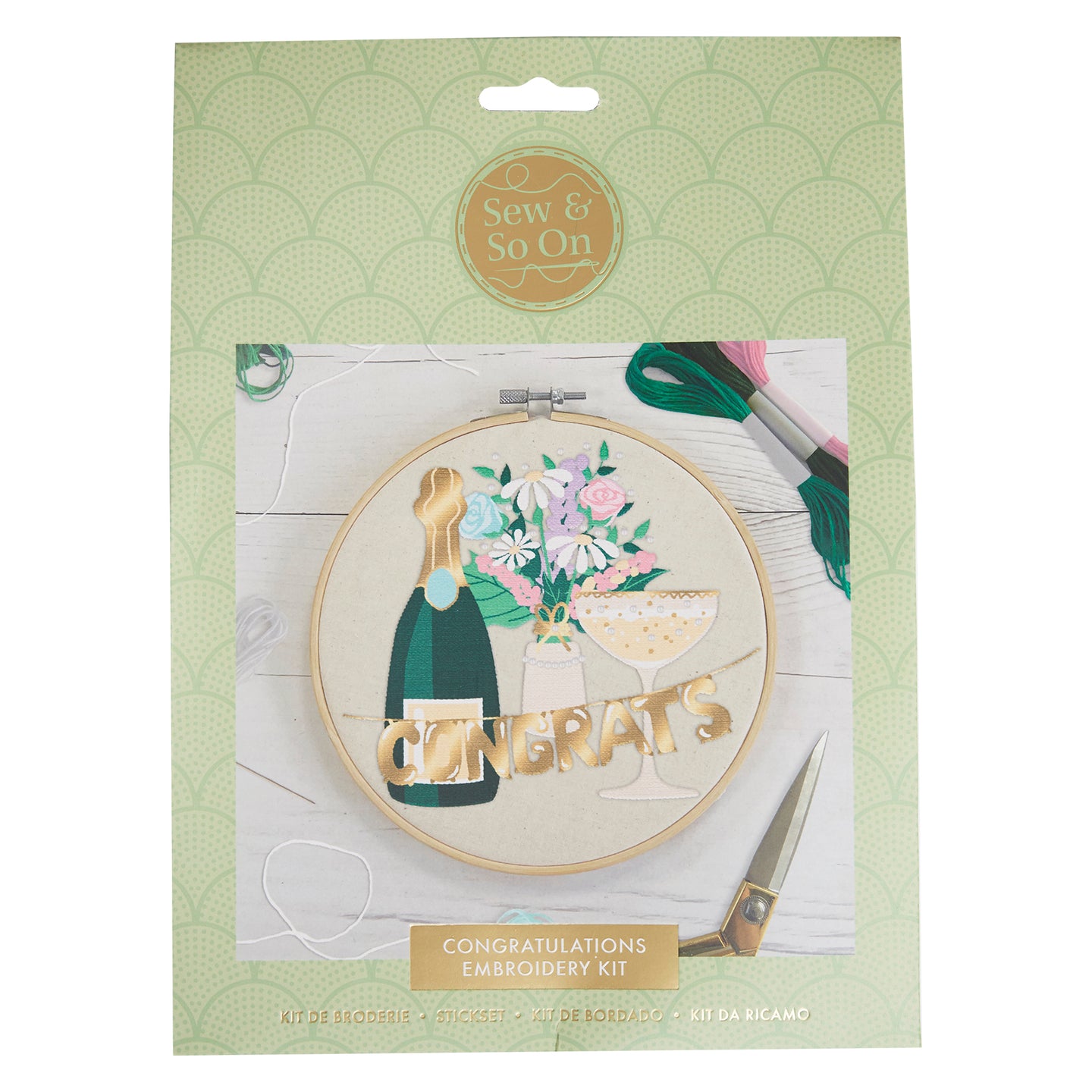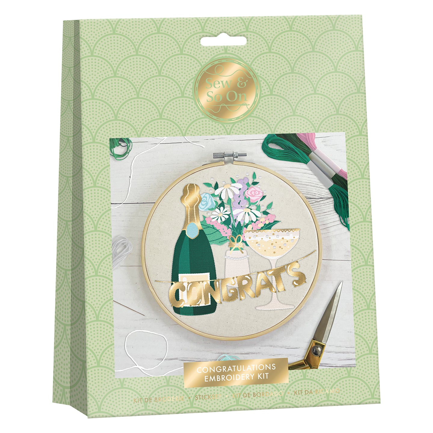 Sew & Sew On Embroidery Kit, Congratulations, Multicoloured, Single Craft Kit, Stitch and Sewing Kit that Includes Embroidery Threads, Craft Kits for Adults UK, Embroidery Kit with Embroidery Hoop