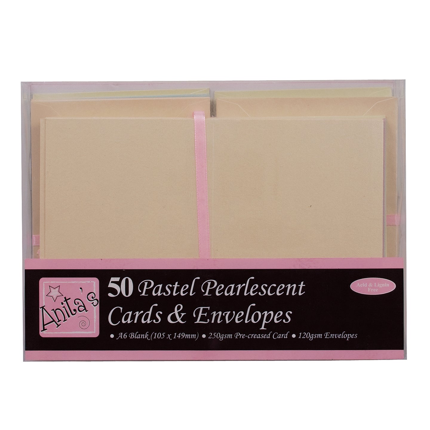 A card pack of 50 x A6 (105x149mm) Cards and Envelopes from Anitas. Quality pastel pearlescent shimmering cards and co-ordinating 120gsm envelopes. Acid and Lignin Free. A must have for any card maker!