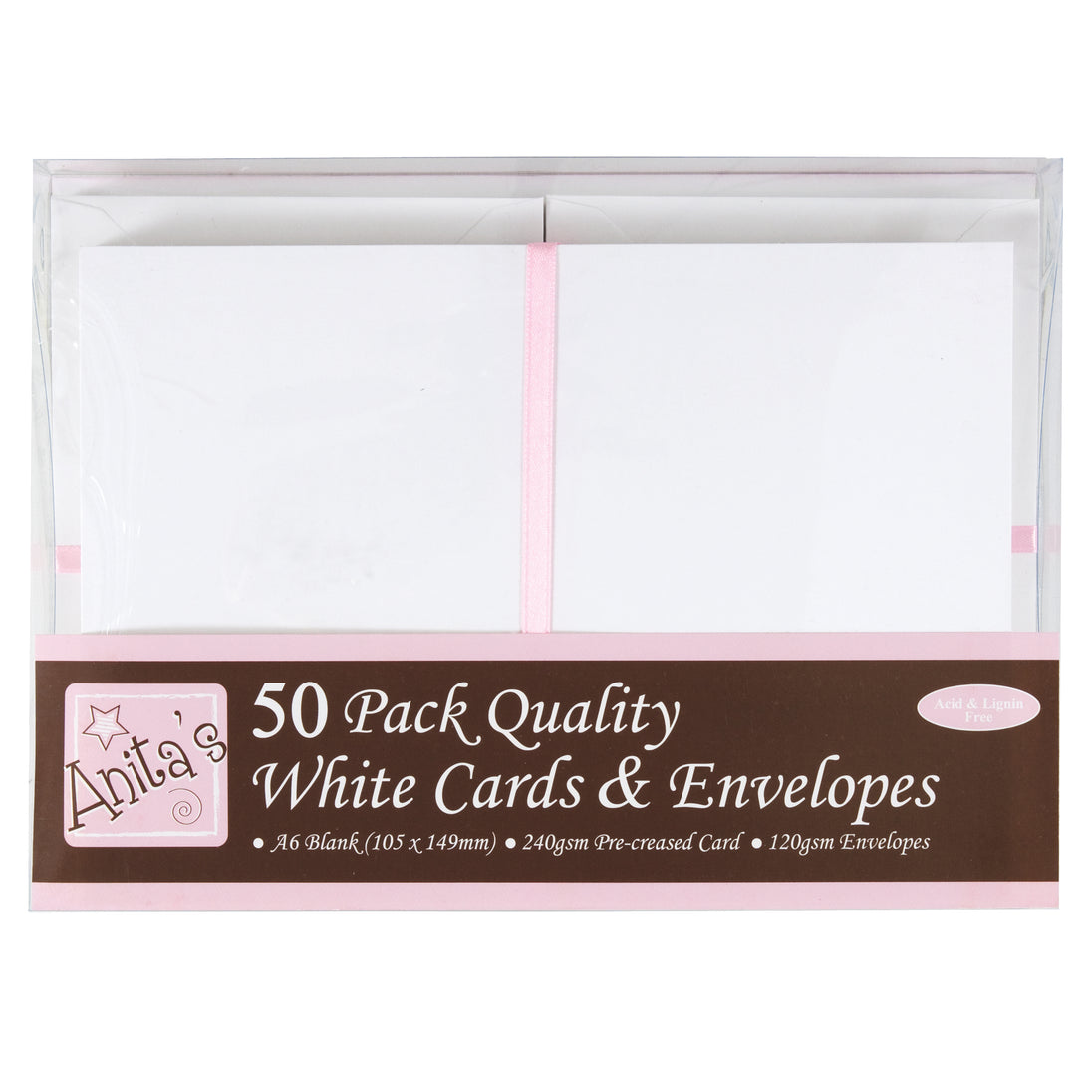 A card pack of 50 x A6 Cards and Envelopes from Anitas. 240gsm quality white cards and co-ordinating envelopes. A must have for any card maker!