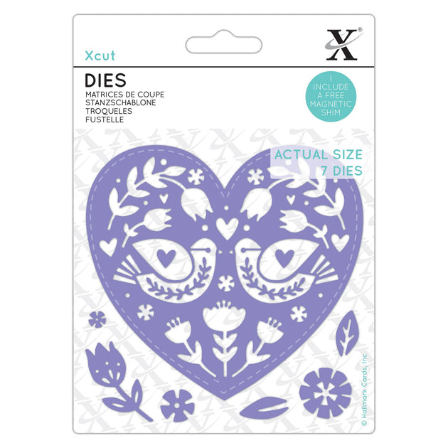 Xcut Dies, Folk Bird Hearts, Silver, Set of 7, Ideal to use on a Birthday Card and Birthday Decoration, Perfect Card Making Supplies for your Craft Sets & Die Cutting Machine