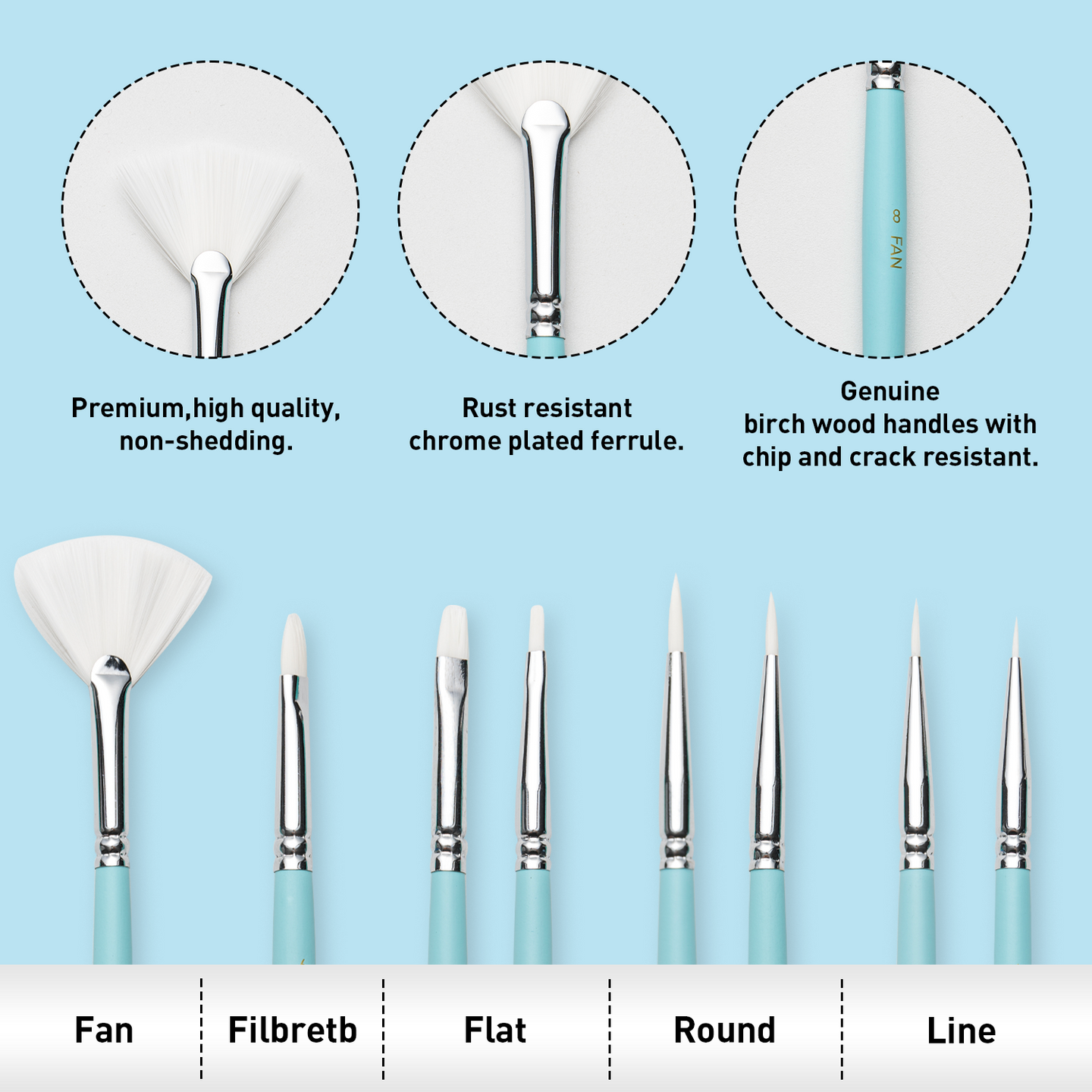 HIMI Paint Brush Set of 8, Includes 1x Fan, 1x Filbret, 2x Flat, 2x Round, 2 Liner Brushes, Blue Case, Gouache, Acrylic, Art Set Supplies, Beginner, Hobby Artist, Matching Case & Handle Colours
