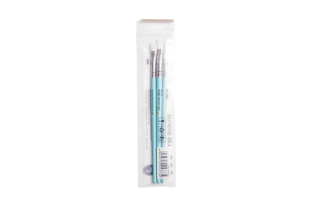 Everyday painting essentials. Three HIMI brushes you’ll use the most in your daily creative process with gouache or acrylic paint. Round for details, flat for bold strokes and fills, and filbert for soft blends. Made for table-size painting and sketching, the short handles feel great in hand and give control over details. The soft nylon bristles load paint beautifully and work smoothly, clean edges, easy flow, no stray hairs. Each brush has a sturdy birch handle painted in blue colour and nickel ferrule, built to last through countless creative sessions. Caring for your brushes is simple: clean the bristles with green soap after each use, shape them gently with your fingers, let them dry, and store them in a brush or paint case. They’ll stay fresh and ready for your next painting.