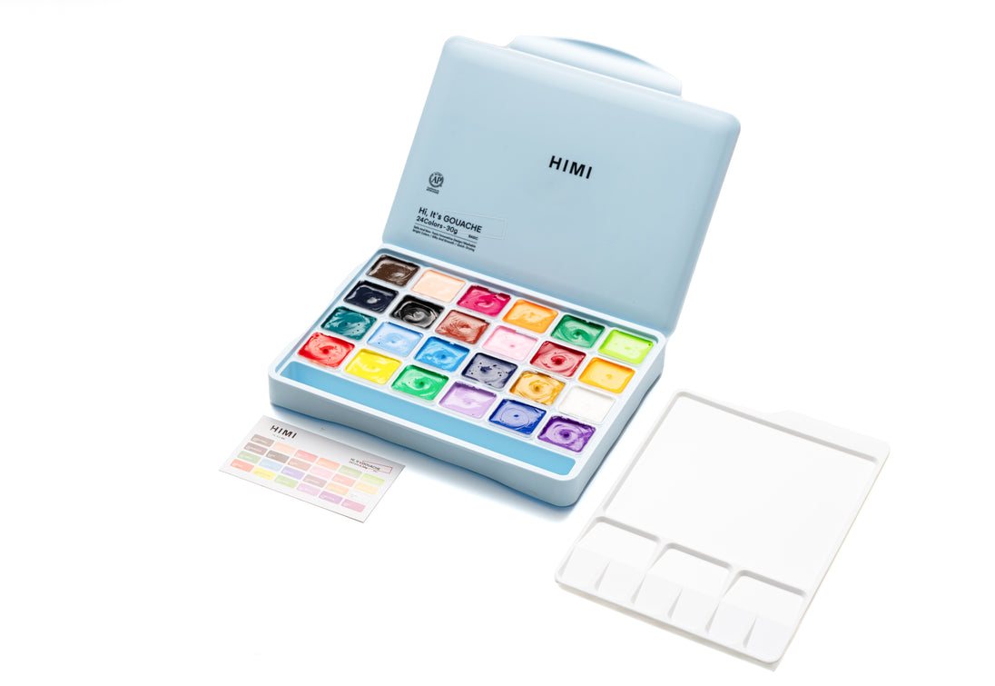 24 basic colours in an ice blue case, opaque gouache paints ready for beginners and creative explorers alike. Paint without pressure. The HIMI Jelly Cup Gouache Set brings together 24 rich colours that stay bright and matte, never chalky or dull. Each colour is made with peach gum and fine pigments for a silky flow and smooth coverage on paper. Gouache reactivates with water, so nothing goes to waste. Just add a drop to bring colours back to life. Easy to clean, safe, and non-toxic, this set is as practical as it is inspiring. Tip: Pair this set with the HIMI Spray to keep paints moist and fresh for longer sessions. The compact ice blue case keeps everything organised and portable, whether you’re painting at home, in class, or on the go. Grab your brush and you can start creating right away. Suitable for artists of every level who want to add colour to their world.