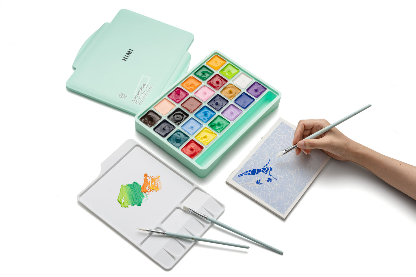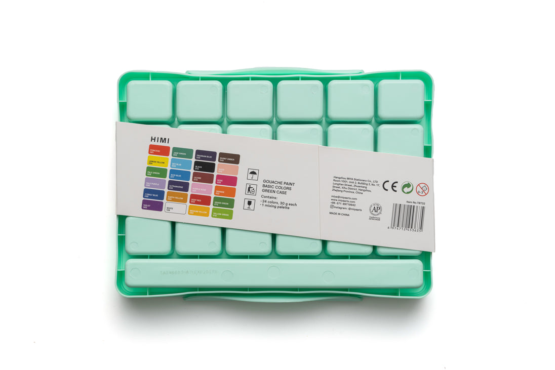 24 basic colours in a green case, opaque gouache paints ready for beginners and creative explorers alike. Paint without pressure. The HIMI Jelly Cup Gouache Set brings together 24 rich colours that stay bright and matte, never chalky or dull. Each colour is made with peach gum and fine pigments for a silky flow and smooth coverage on paper. Gouache reactivates with water, so nothing goes to waste. Just add a drop to bring colours back to life. Easy to clean, safe, and non-toxic, this set is as practical as it is inspiring. Tip: Pair this set with the HIMI Spray to keep paints moist and fresh for longer sessions. The compact green case keeps everything organised and portable, whether you’re painting at home, in class, or on the go. Grab your brush and you can start creating right away. Suitable for artists of every level who want to add colour to their world.