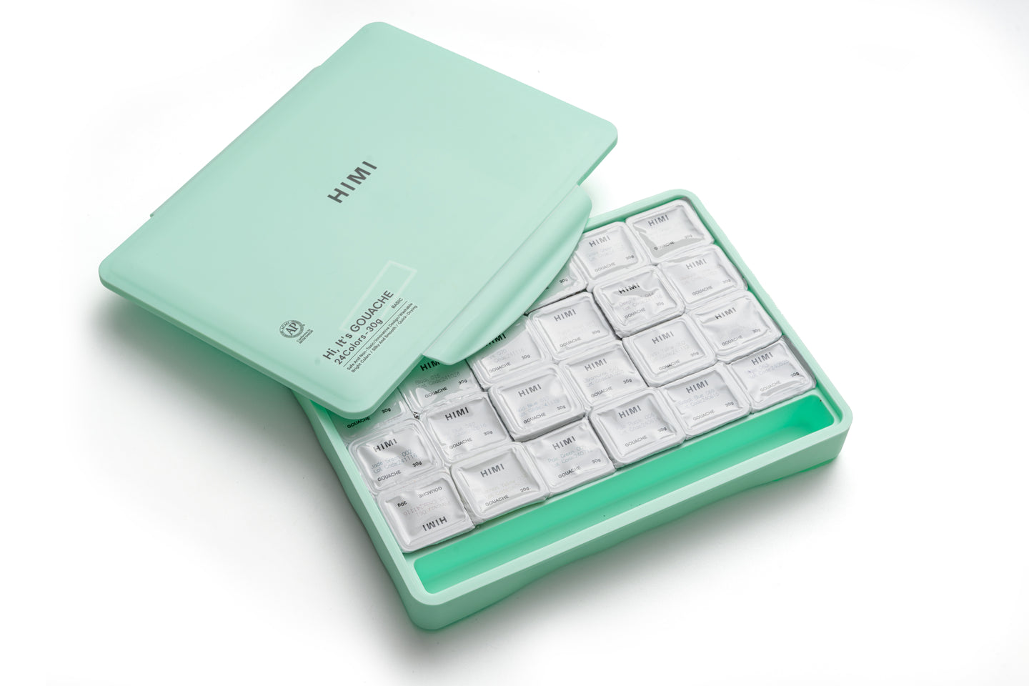 HIMI Jelly Cup Gouache Set 24 Paint Colours, Green Case, Add Water To Reactivate, Smooth, Rich Colours, Gift, Artist Art Supplies, Large Scale Art Work To Fine Details, Ready To Use Gouache Colors