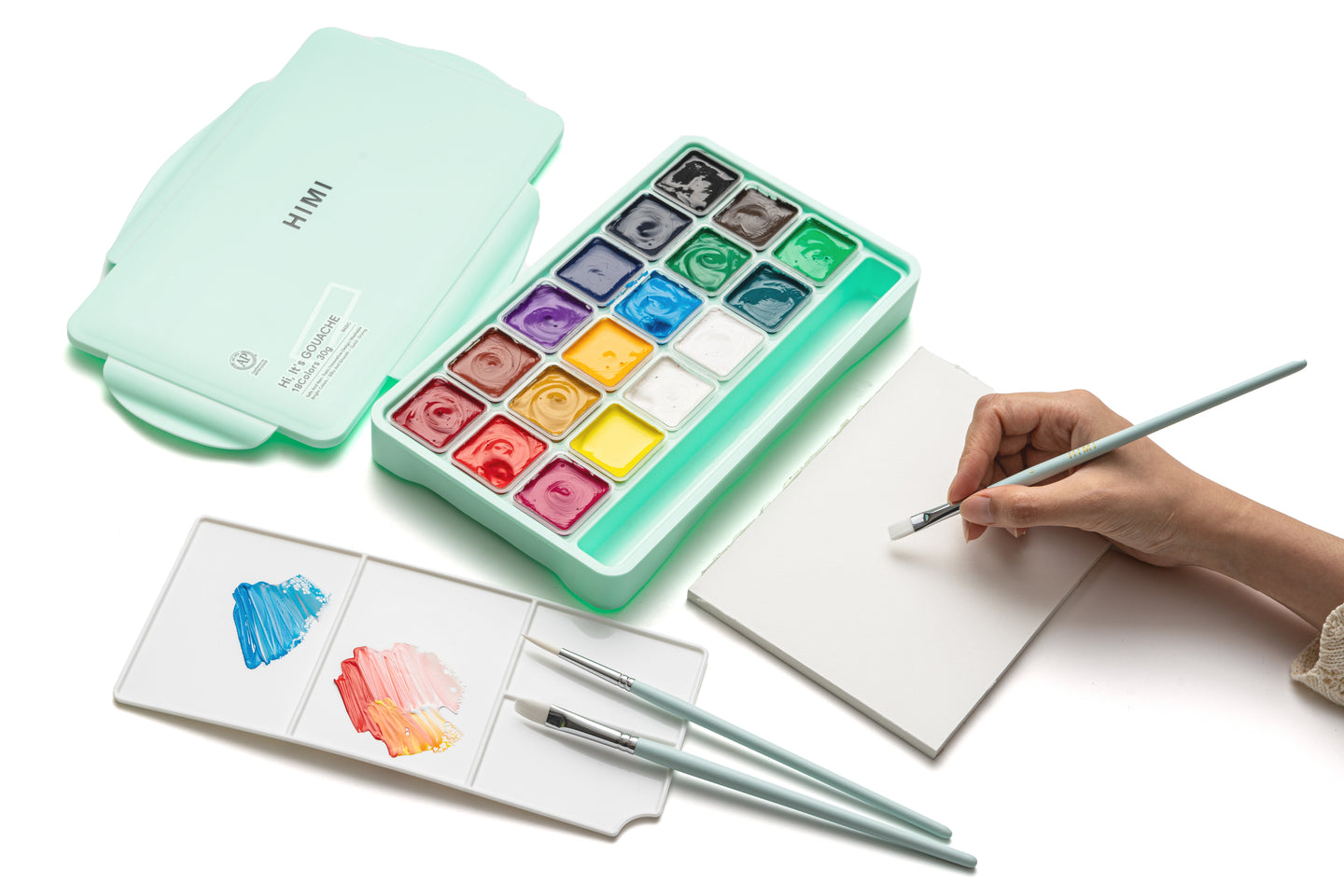 18 vibrant colours in a green case, opaque gouache paints ready for beginners and creative explorers alike. Paint without pressure. The HIMI Jelly Cup Gouache Set brings together 18 rich colours that stay bright and matte, never chalky or dull. Each colour is made with peach gum and fine pigments for a silky flow and smooth coverage on paper. Gouache reactivates with water, so nothing goes to waste. Just add a drop to bring colours back to life. Easy to clean, safe, and non-toxic, this set is as practical as it is inspiring. Tip: Pair this set with the HIMI Spray to keep paints moist and fresh for longer sessions. The compact green case keeps everything organised and portable, whether you’re painting at home, in class, or on the go. Grab your brush and you can start creating right away. Suitable for artists of every level who want to add colour to their world.