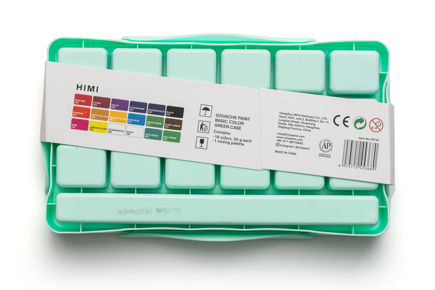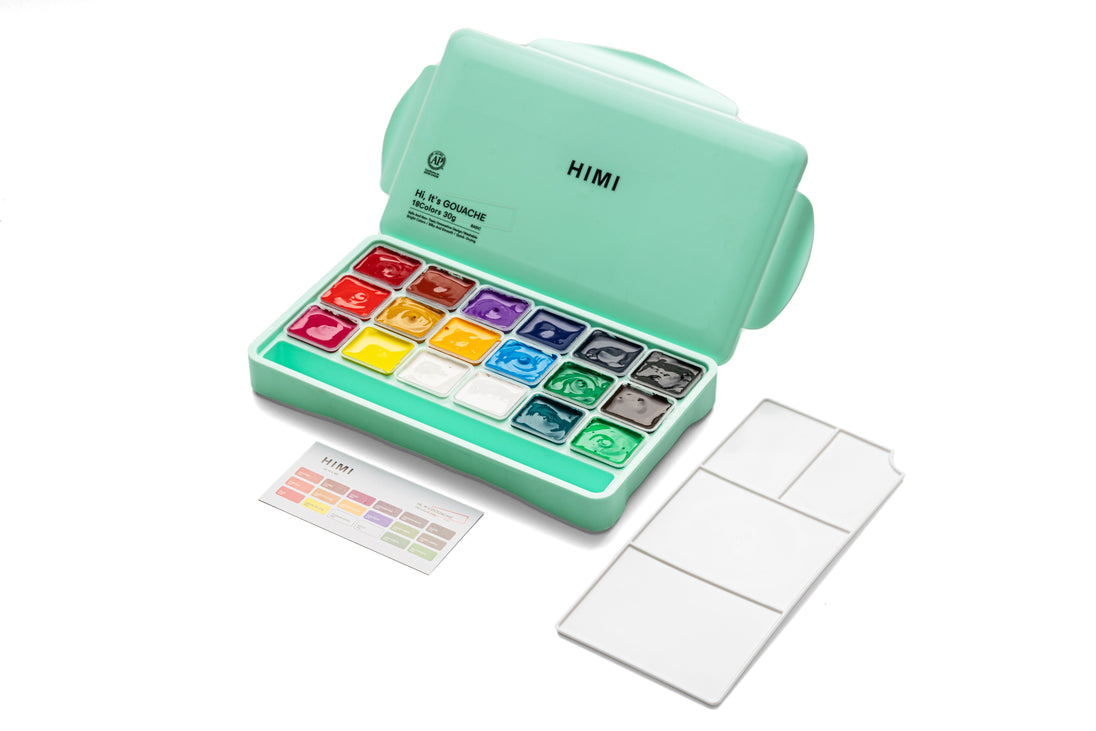 HIMI Jelly Cup Gouache Set 18 Paint Colours, Green Case, Add Water To Reactivate, Smooth, Rich Colours, Gift, Artist Art Supplies, Large Scale Art Work To Fine Details, Ready To Use Gouache Colors