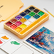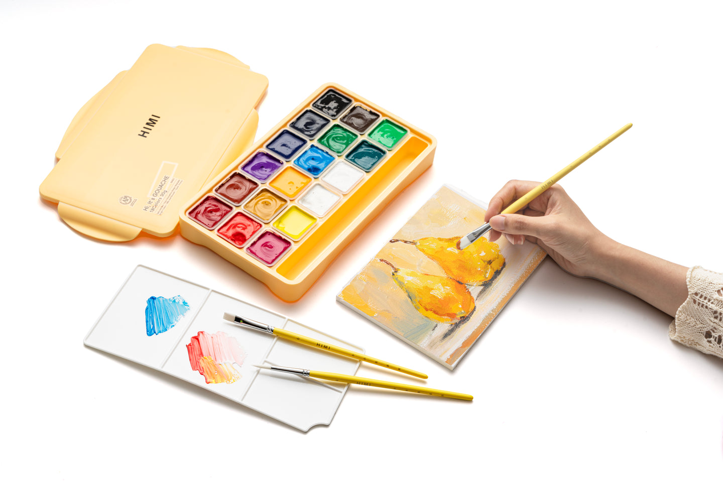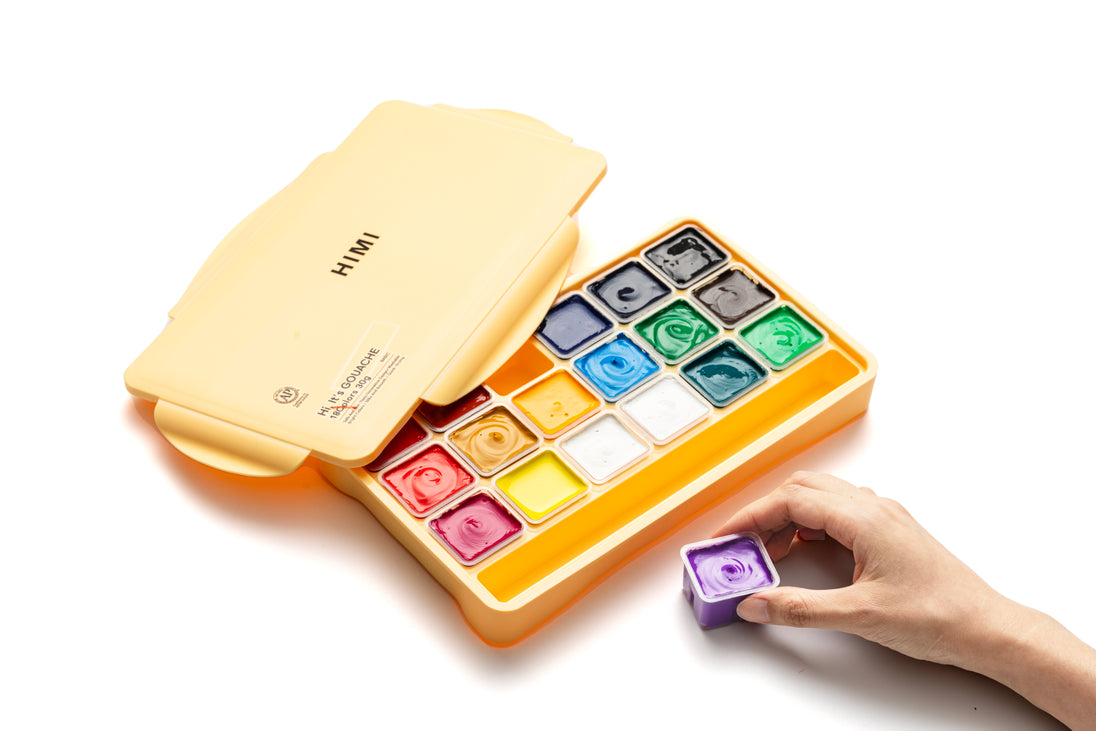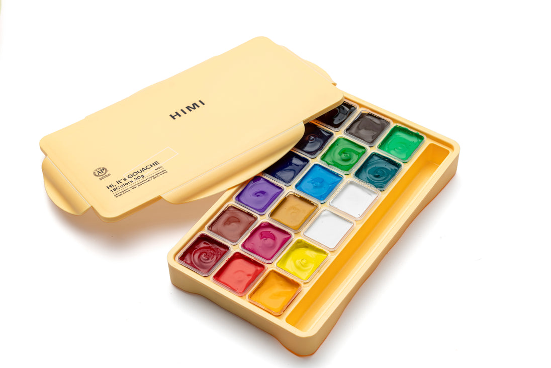 18 vibrant colours in a yellow case, opaque gouache paints ready for beginners and creative explorers alike. Paint without pressure. The HIMI Jelly Cup Gouache Set brings together 18 rich colours that stay bright and matte, never chalky or dull. Each colour is made with peach gum and fine pigments for a silky flow and smooth coverage on paper. Gouache reactivates with water, so nothing goes to waste. Just add a drop to bring colours back to life. Easy to clean, safe, and non-toxic, this set is as practical as it is inspiring. Tip: Pair this set with the HIMI Spray to keep paints moist and fresh for longer sessions. The compact yellow case keeps everything organised and portable, whether you’re painting at home, in class, or on the go. Grab your brush and you can start creating right away. Suitable for artists of every level who want to add colour to their world.