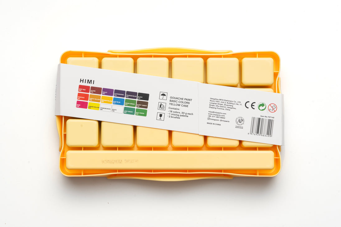 HIMI Jelly Cup Gouache Set 18 Paint Colours, Yellow Case, Add Water To Reactivate, Smooth, Rich Colours, Gift, Artist Art Supplies, Large Scale Art Work To Fine Details, Ready To Use Gouache Colors