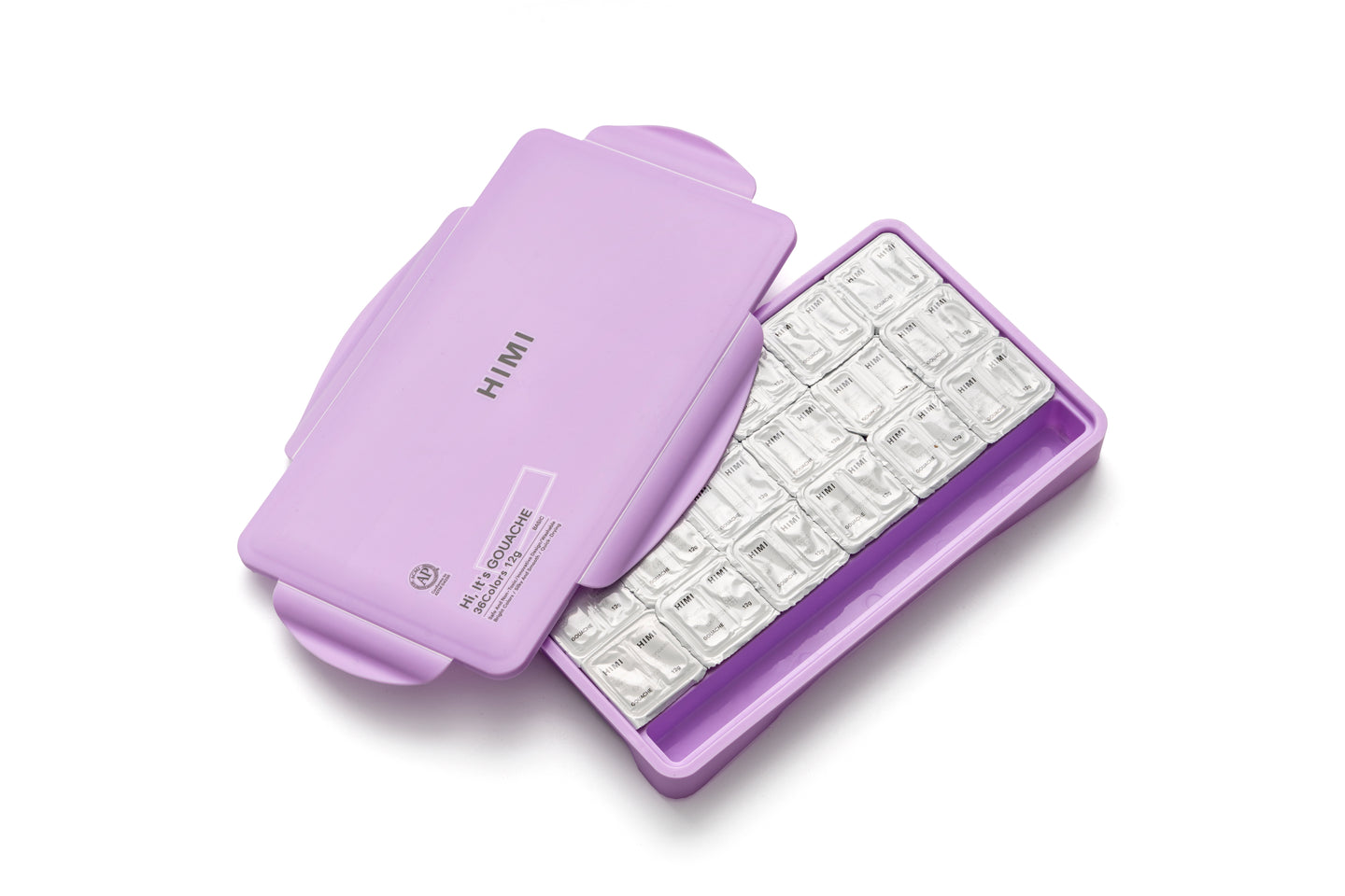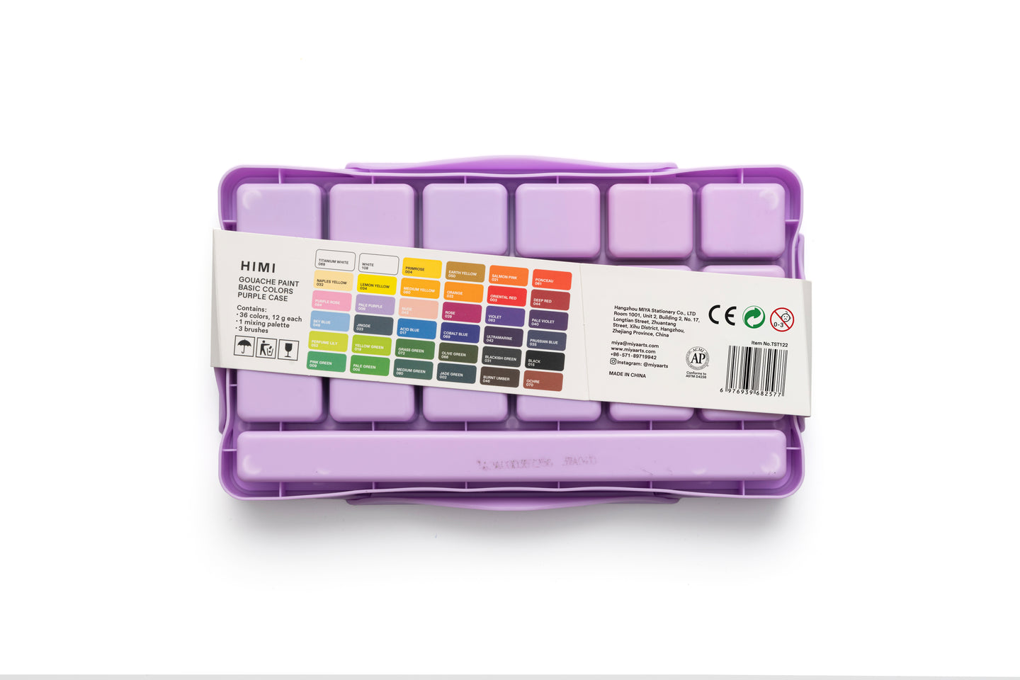 HIMI Twin Cup Gouache Set 36 Paint Colours, 3 Brushes, Paint Pallete, Purple Case, Add Water To Reactivate, Smooth, Rich Colours, Gift, Artist Art Supplies, Large Scale Art Work To Fine Details