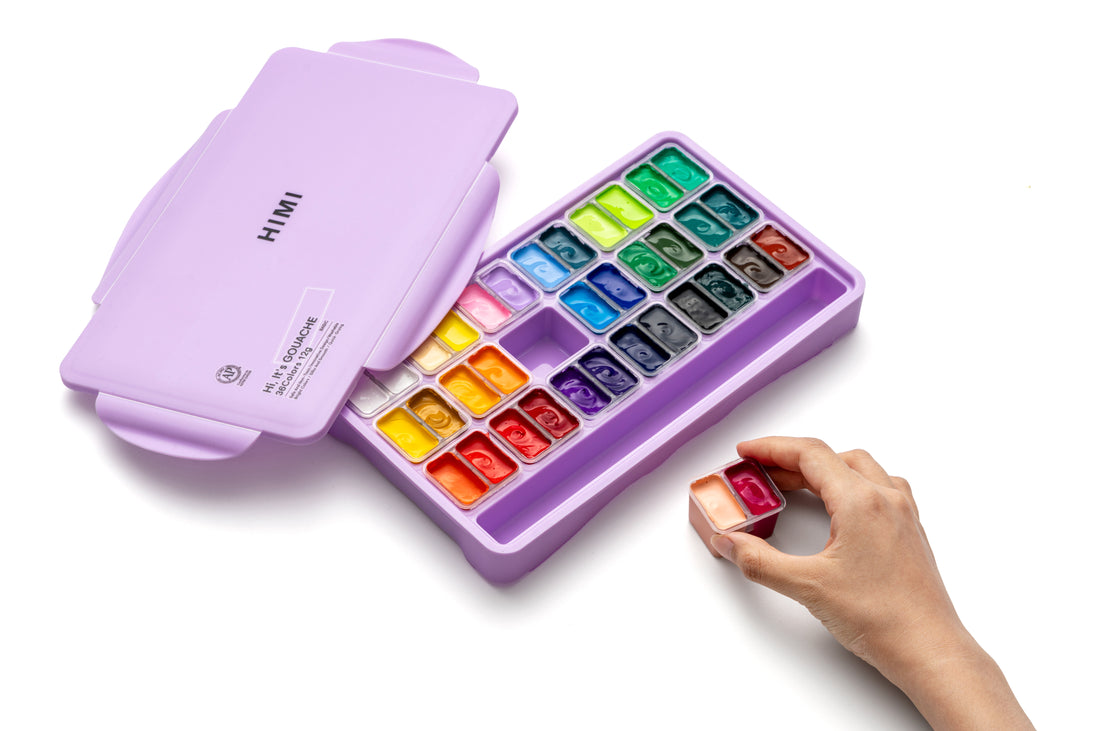 36 vibrant colours in a playful purple case, opaque gouache paints with 3 handy brushes, ready for beginners and creative explorers alike. Paint without pressure. The HIMI Twin Cup Gouache Set brings together 36 rich colours that stay bright and matte, never chalky or dull. Each colour is made with peach gum and fine pigments for a silky flow and smooth coverage on paper. Gouache reactivates with water, so nothing goes to waste. Just add a drop to bring colours back to life. Easy to clean, safe, and non-toxic, this set is as practical as it is inspiring. Tip: Pair this set with the HIMI Spray to keep paints moist and fresh for longer sessions. The compact case keeps everything organised and portable, whether you’re painting at home, in class, or on the go. Along with the paints, you’ll find 3 versatile synthetic brushes: round, flat, and filbert in popular everyday sizes, so you can start creating right away. Suitable for artists of every level who want to add colour to their world.