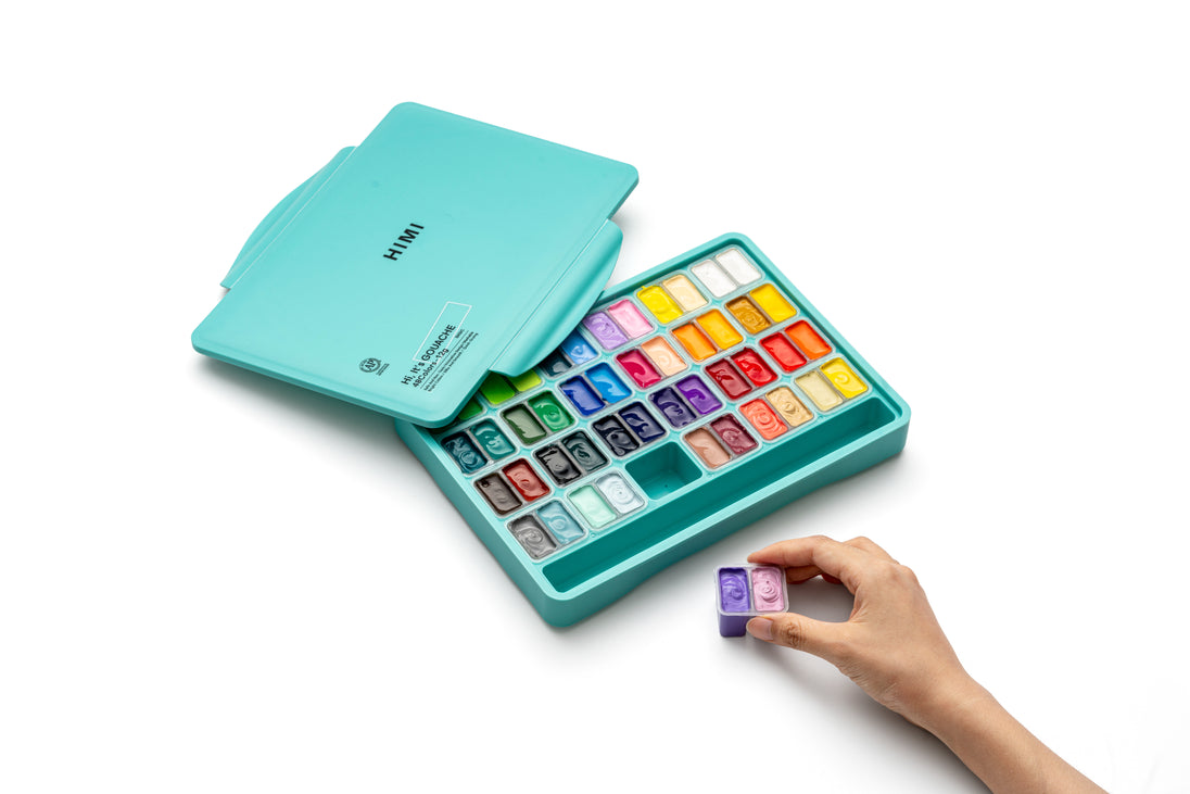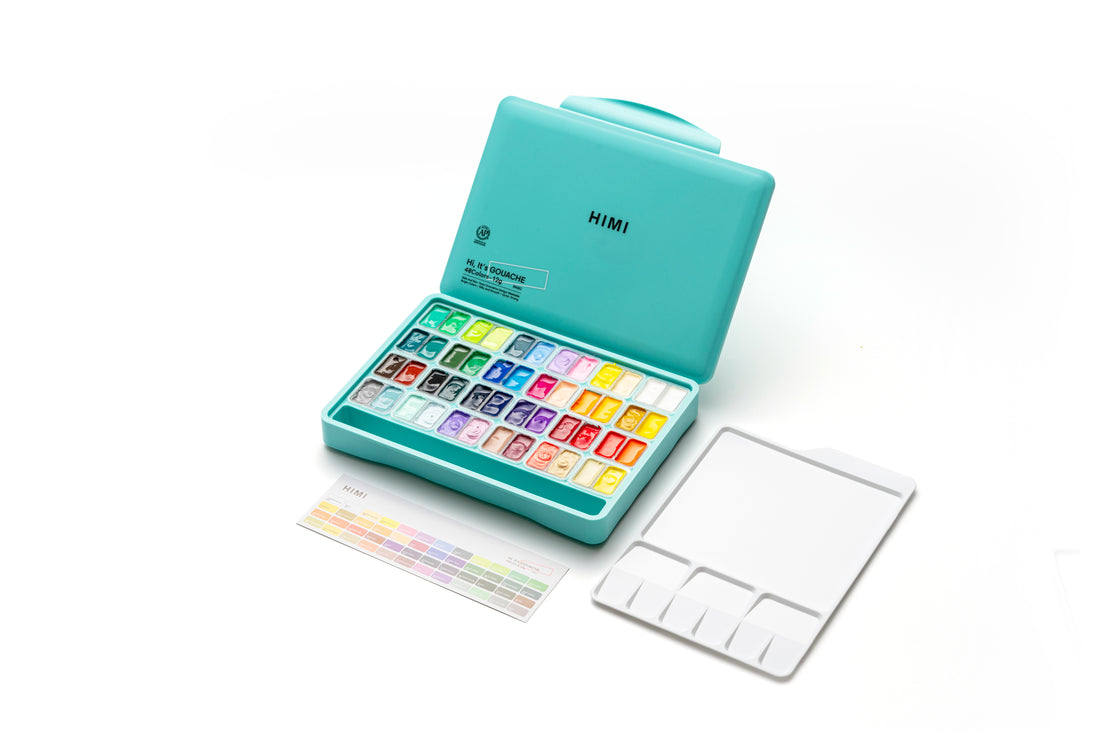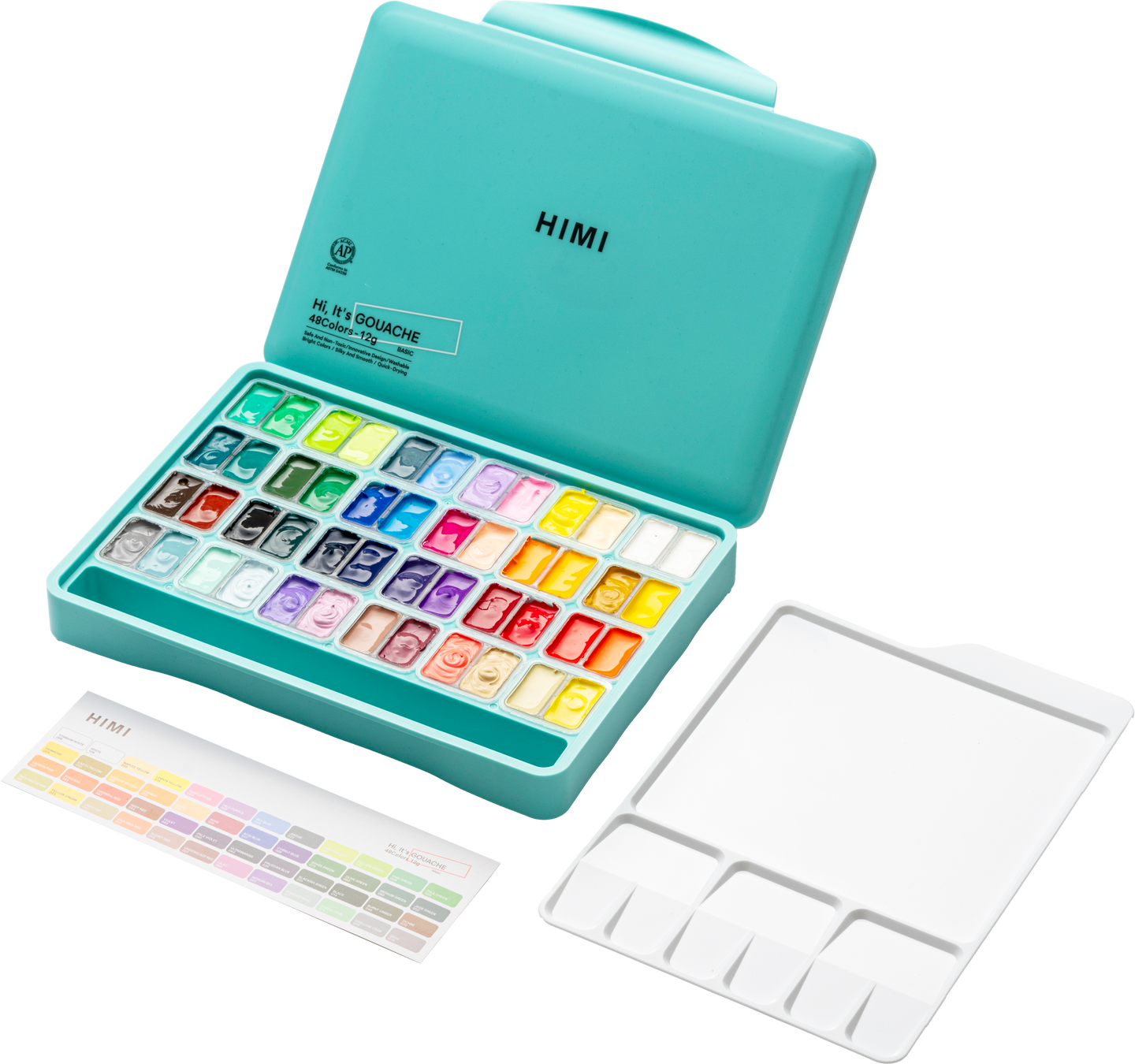 48 vibrant colours in a playful green case, opaque gouache paints, ready for beginners and creative explorers alike. Paint without pressure. The HIMI Twin Cup Gouache Set brings together 48 rich colours that stay bright and matte, never chalky or dull. Each colour is made with peach gum and fine pigments for a silky flow and smooth coverage on paper. Gouache reactivates with water, so nothing goes to waste. Just add a drop to bring colours back to life. Easy to clean, safe, and non-toxic, this set is as practical as it is inspiring. Tip: Pair this set with the HIMI Spray to keep paints moist and fresh for longer sessions. The compact case keeps everything organised and portable, whether you’re painting at home, in class, or on the go. Grab your brush and you can start creating right away. Suitable for artists of every level who want to add colour to their world.