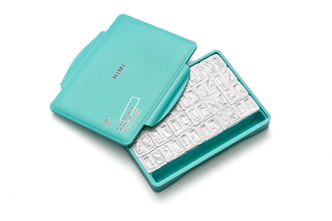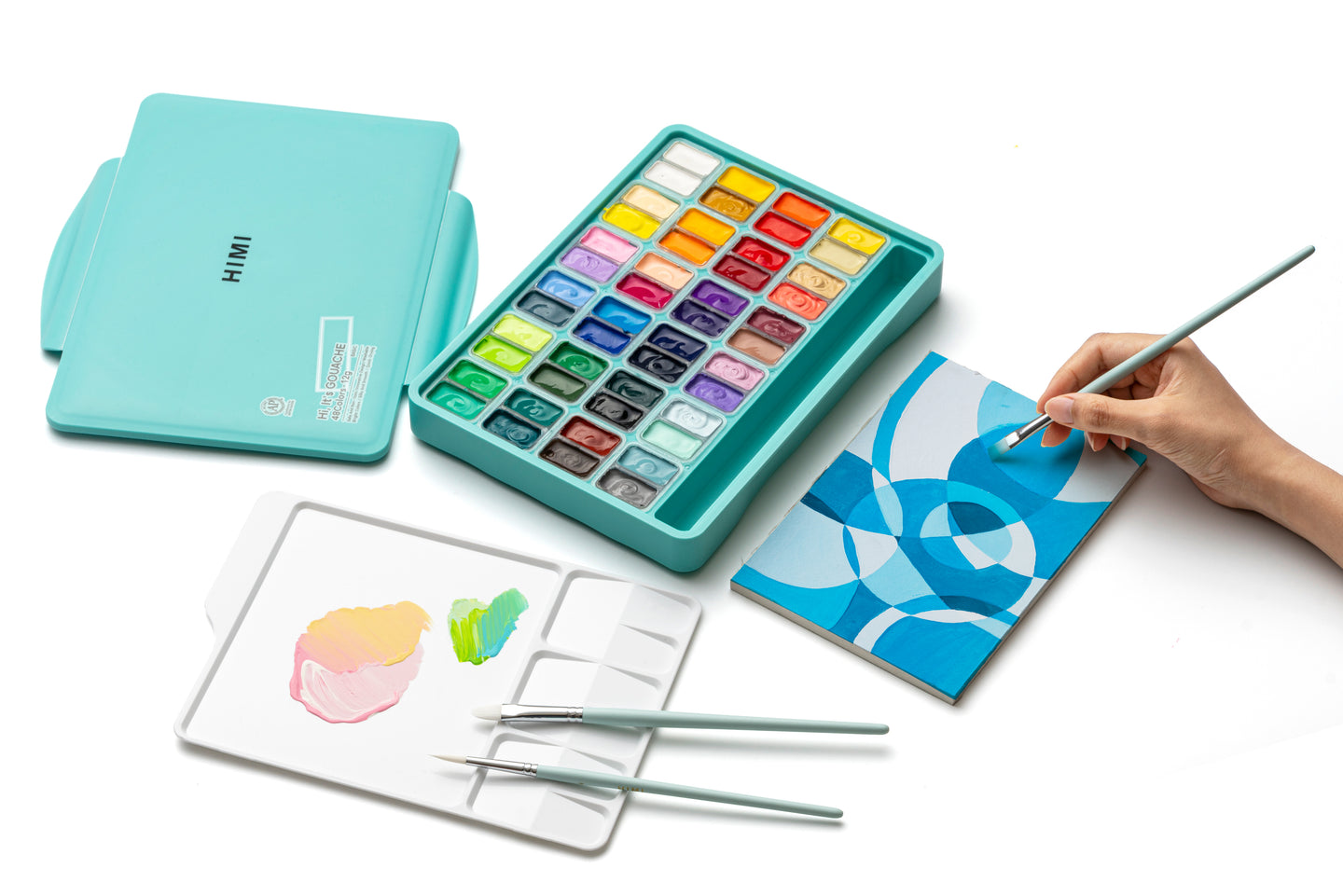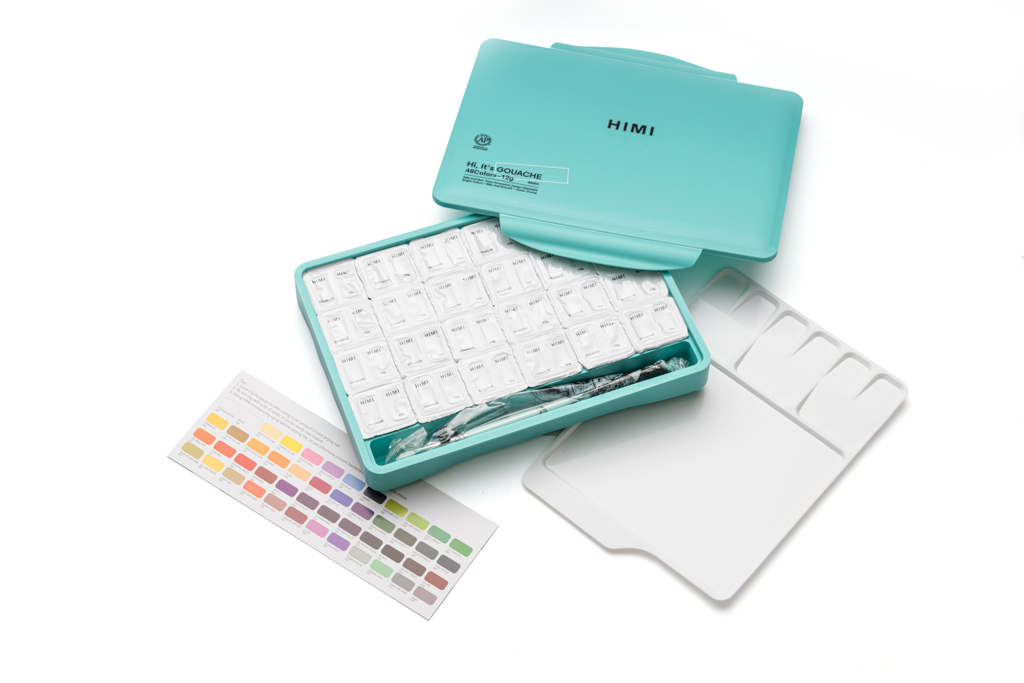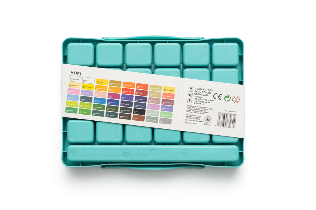 HIMI Twin Cup Gouache Set 48 Paint Colours, 3 Brushes, Paint Pallete, Green Case, Add Water To Reactivate, Smooth, Rich Colours, Gift, Artist Art Supplies, Large Scale Art Work To Fine Details
