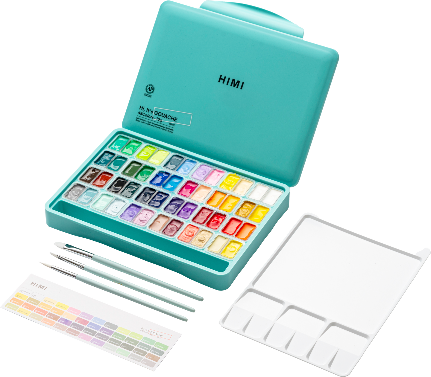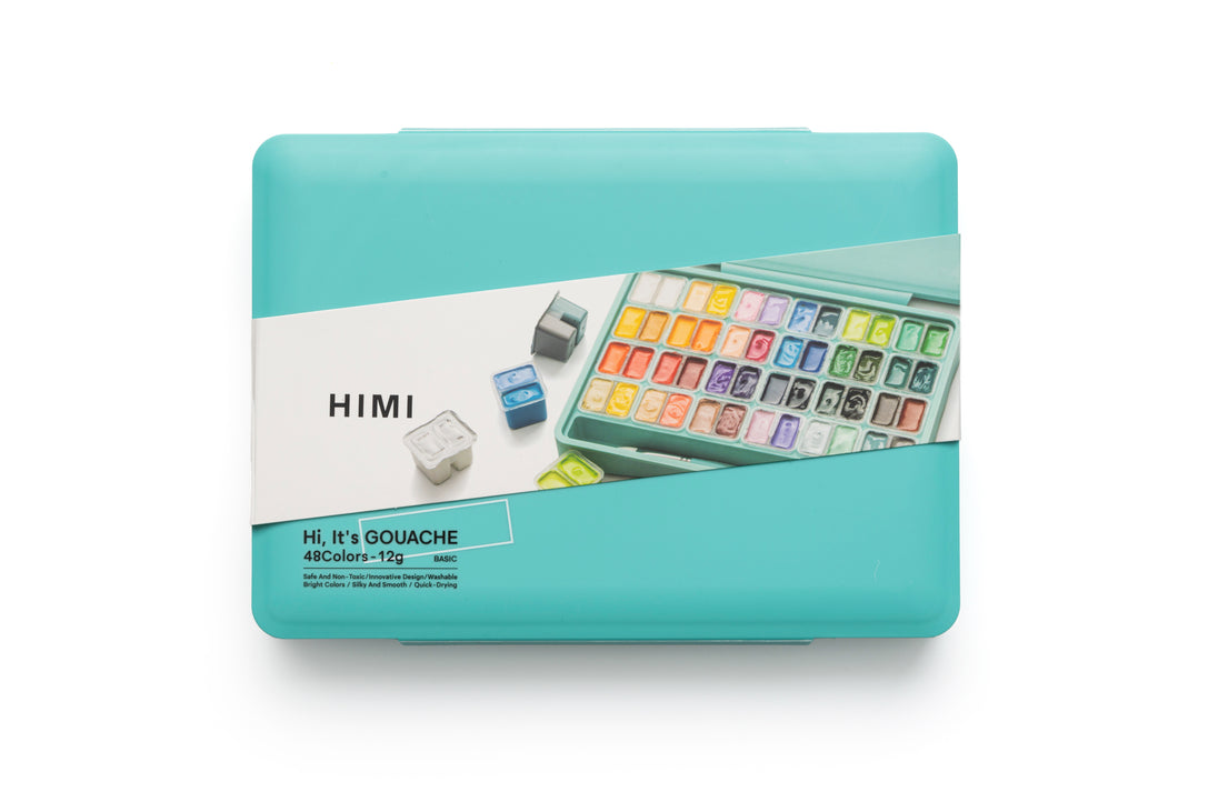 48 vibrant colours in a playful green case, opaque gouache paints with 3 handy brushes, ready for beginners and creative explorers alike. Paint without pressure. The HIMI Twin Cup Gouache Set brings together 48 rich colours that stay bright and matte, never chalky or dull. Each colour is made with peach gum and fine pigments for a silky flow and smooth coverage on paper. Gouache reactivates with water, so nothing goes to waste. Just add a drop to bring colours back to life. Easy to clean, safe, and non-toxic, this set is as practical as it is inspiring. Tip: Pair this set with the HIMI Spray to keep paints moist and fresh for longer sessions. The compact case keeps everything organised and portable, whether you’re painting at home, in class, or on the go. Along with the paints, you’ll find 3 versatile synthetic brushes: round, flat, and filbert in popular everyday sizes, so you can start creating right away. Suitable for artists of every level who want to add colour to their world.
