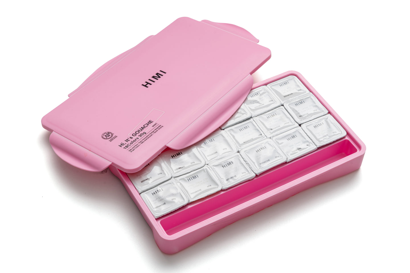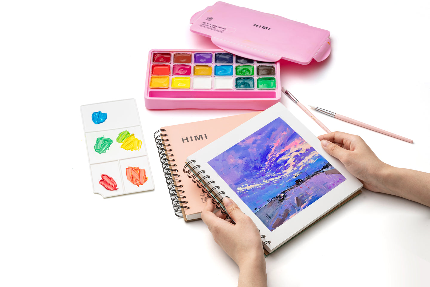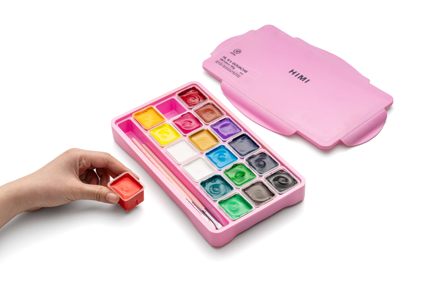 HIMI Jelly Cup Gouache Set 18 Paint Colours, 3 Brushes, Paint Pallete, Pink Case, Add Water To Reactivate, Smooth, Rich Colours, Gift, Artist Art Supplies, Large Scale Art Work To Fine Details