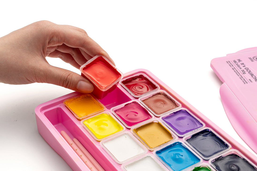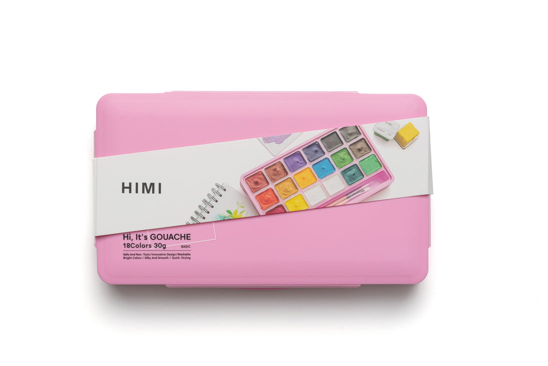 18 vibrant colours in a pink case, opaque gouache paints with 3 handy brushes, ready for beginners and creative explorers alike. Paint without pressure. The HIMI Jelly Cup Gouache Set brings together 18 rich colours that stay bright and matte, never chalky or dull. Each colour is made with peach gum and fine pigments for a silky flow and smooth coverage on paper. Gouache reactivates with water, so nothing goes to waste. Just add a drop to bring colours back to life. Easy to clean, safe, and non-toxic, this set is as practical as it is inspiring. Tip: Pair this set with the HIMI Spray to keep paints moist and fresh for longer sessions. The compact case keeps everything organised and portable, whether you’re painting at home, in class, or on the go. Along with the paints, you’ll find 3 versatile synthetic brushes: round, flat, and filbert in popular everyday sizes, so you can start creating right away. Suitable for artists of every level who want to add colour to their world.