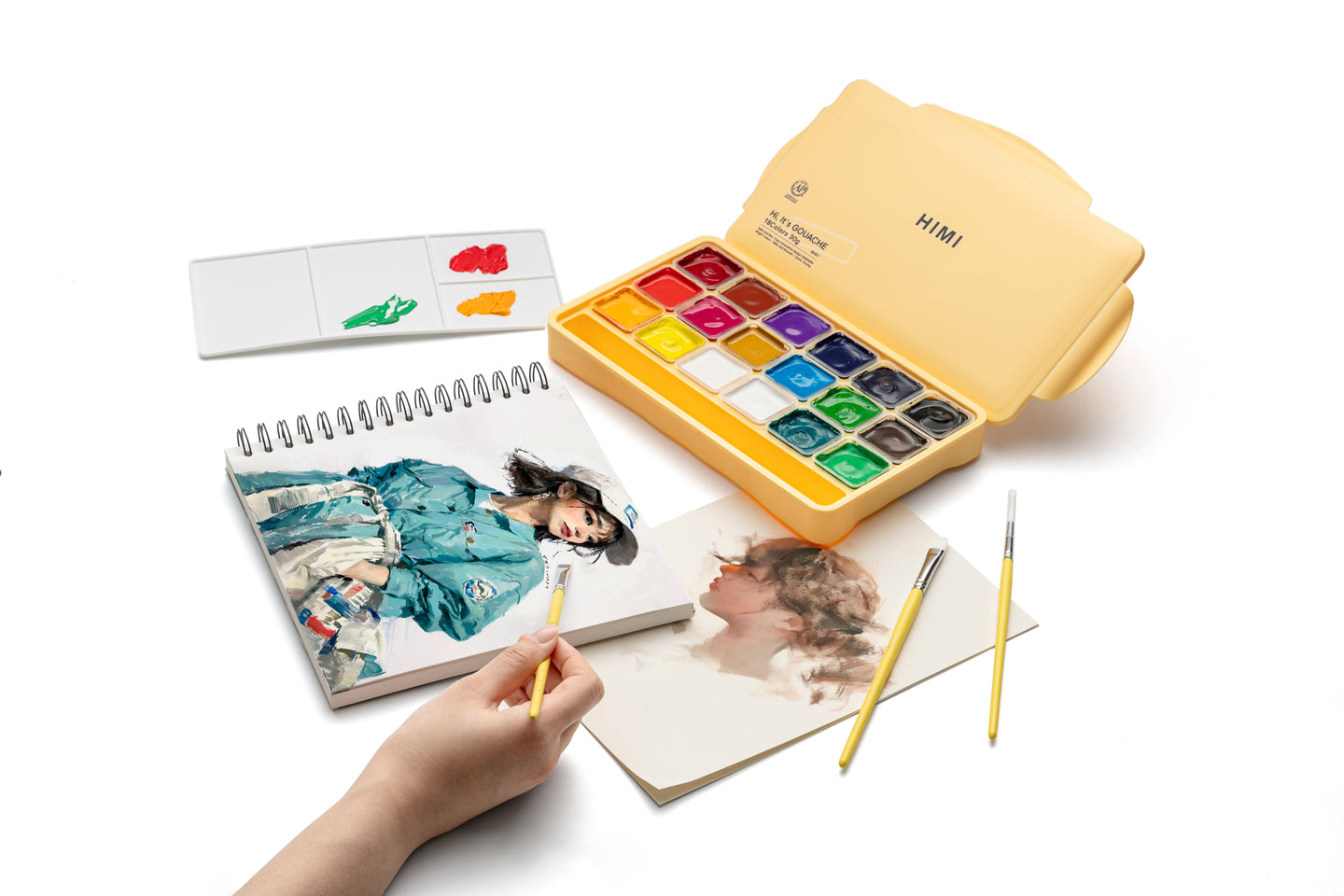 HIMI Jelly Cup Gouache Set 18 Paint Colours, 3 Brushes, Paint Pallete, Yellow Case, Add Water To Reactivate, Smooth, Rich Colours, Gift, Artist Art Supplies, Large Scale Art Work To Fine Details