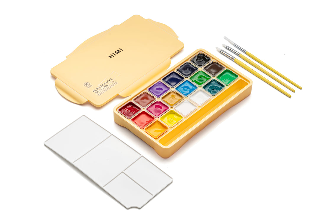 18 vibrant colours in a yellow case, opaque gouache paints with 3 handy brushes, ready for beginners and creative explorers alike. Paint without pressure. The HIMI Jelly Cup Gouache Set brings together 18 rich colours that stay bright and matte, never chalky or dull. Each colour is made with peach gum and fine pigments for a silky flow and smooth coverage on paper. Gouache reactivates with water, so nothing goes to waste. Just add a drop to bring colours back to life. Easy to clean, safe, and non-toxic, this set is as practical as it is inspiring. Tip: Pair this set with the HIMI Spray to keep paints moist and fresh for longer sessions. The compact case keeps everything organised and portable, whether you’re painting at home, in class, or on the go. Along with the paints, you’ll find 3 versatile synthetic brushes: round, flat, and filbert in popular everyday sizes, so you can start creating right away. Suitable for artists of every level who want to add colour to their world.