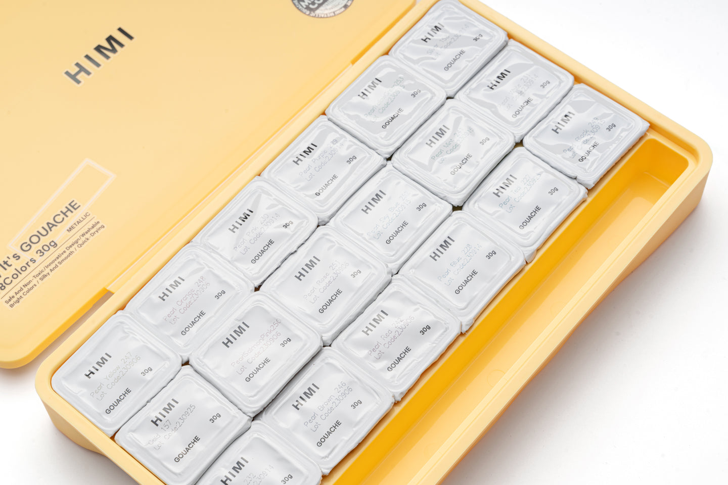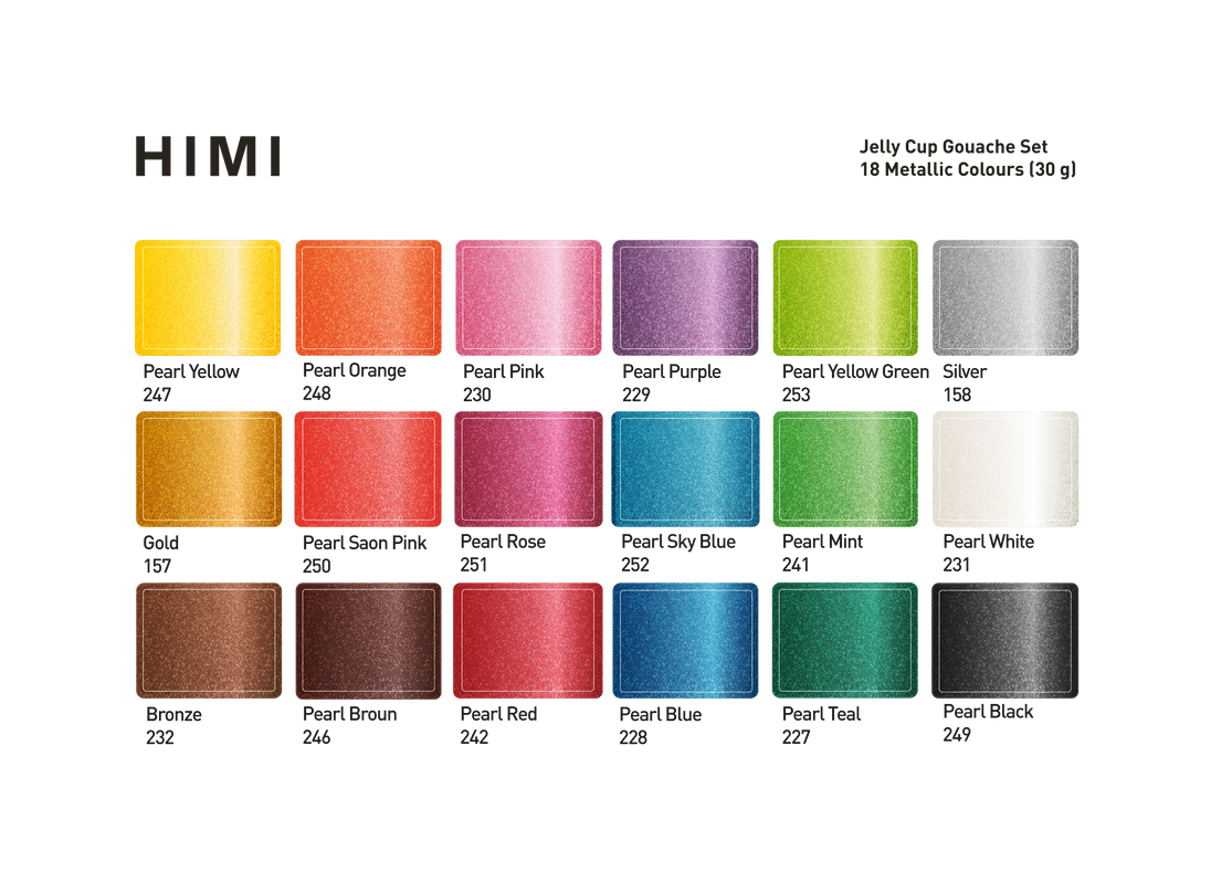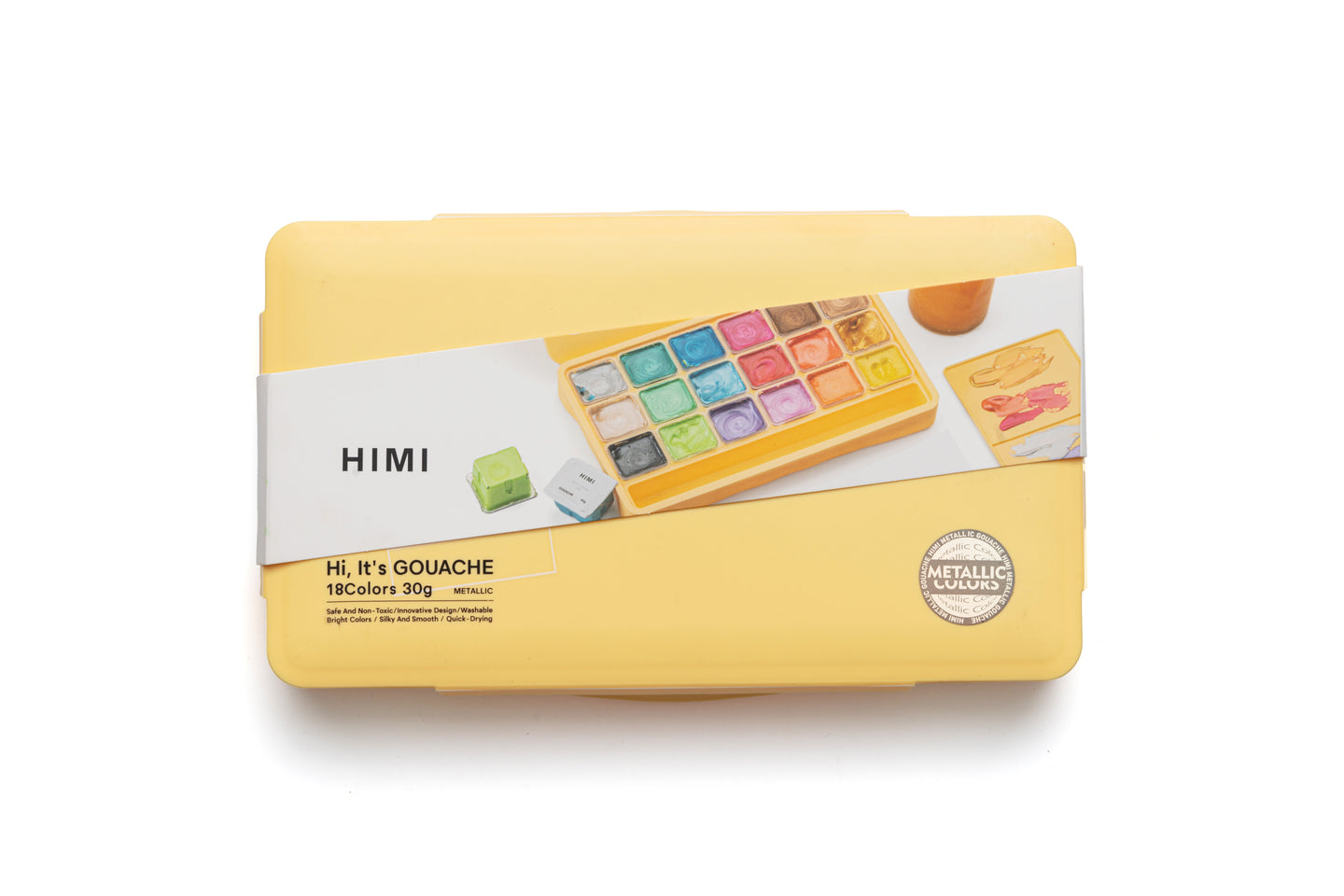 18 shimmering metallic colours in a yellow case, smooth opaque gouache paints that add shine and depth to your creative work. Paint with a spark. The HIMI Jelly Cup Gouache Set – Metallic Edition includes 18 rich metallic shades that blend creamy texture with a radiant finish. Each colour is made with peach gum, fine pigments, and mica, giving a silky flow, excellent coverage, and a beautiful reflective glow that stays smooth and even on paper. Gouache reactivates with water, so nothing goes to waste. Just add a drop to bring colours back to life. Easy to clean, safe, and non-toxic, this set is as practical as it is inspiring. Tip: Pair this set with the HIMI Spray to keep paints moist and fresh for longer sessions. The compact yellow case keeps paints organised and portable, whether you’re creating at home, in class, or on the go. Ideal for artists, students, and hobbyists who want to add metallic shine and sparkle to their artwork.