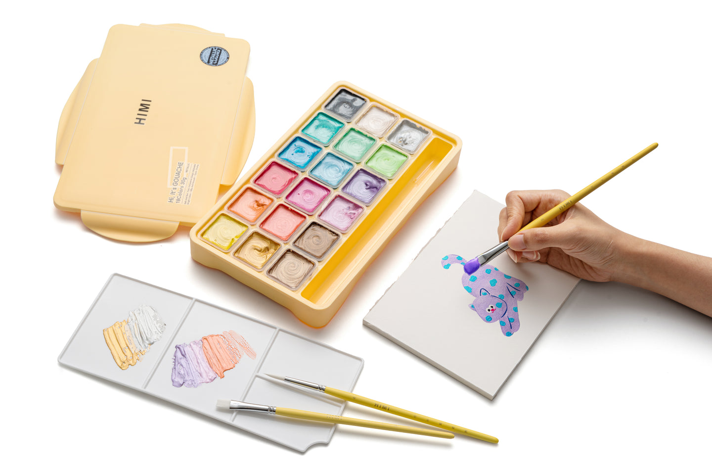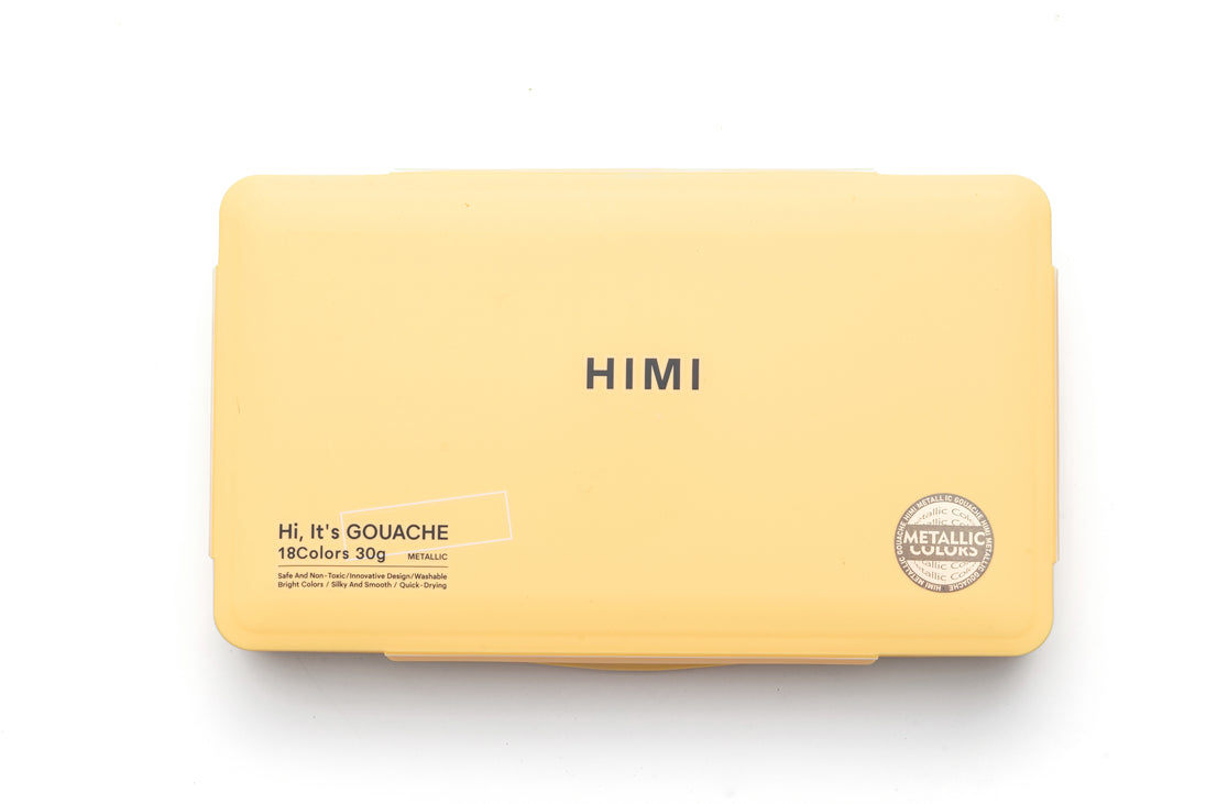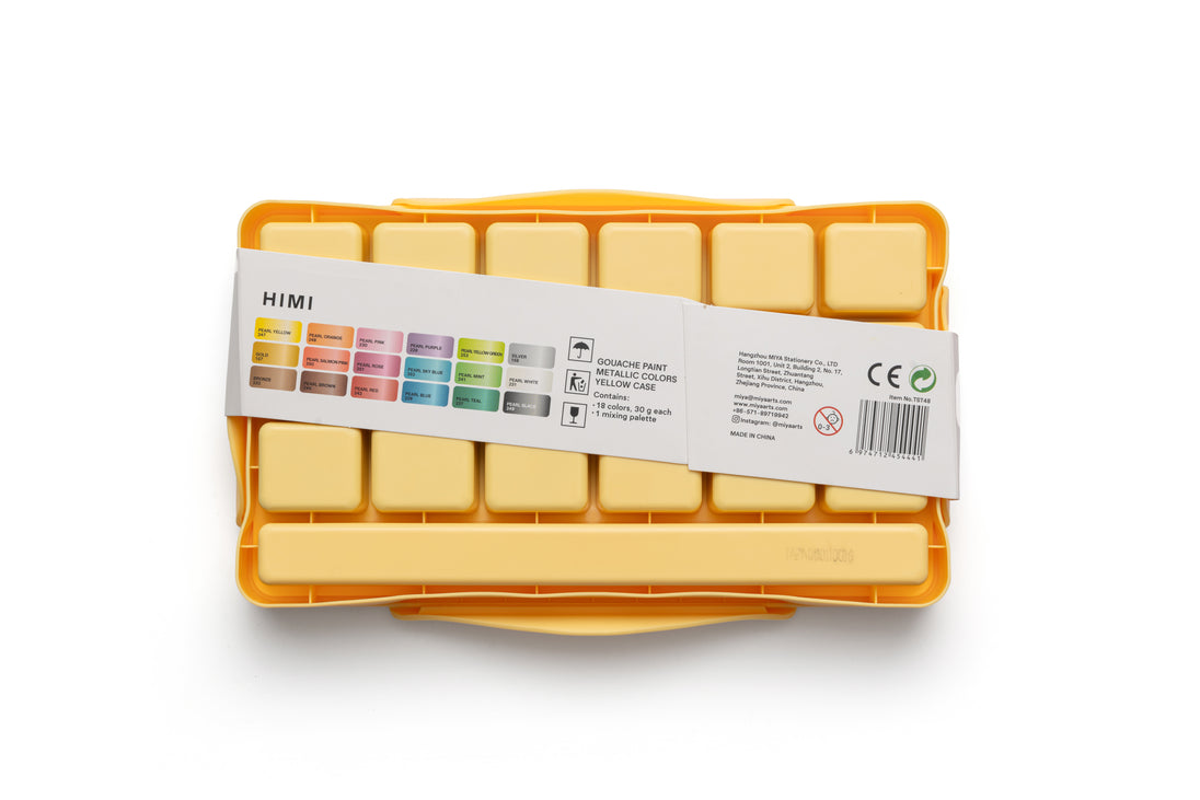 HIMI Jelly Cup Gouache Set 18 Paint Colours, 3 Brushes, Paint Pallete, Yellow Case Metallic, Add Water To Reactivate, Smooth, Rich Colours, Gift, Artist Art Supplies, Large Scale Art Work Fine Details