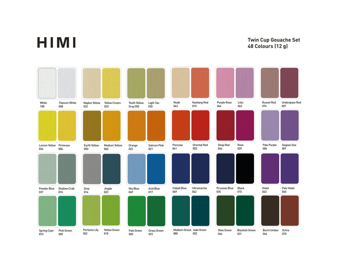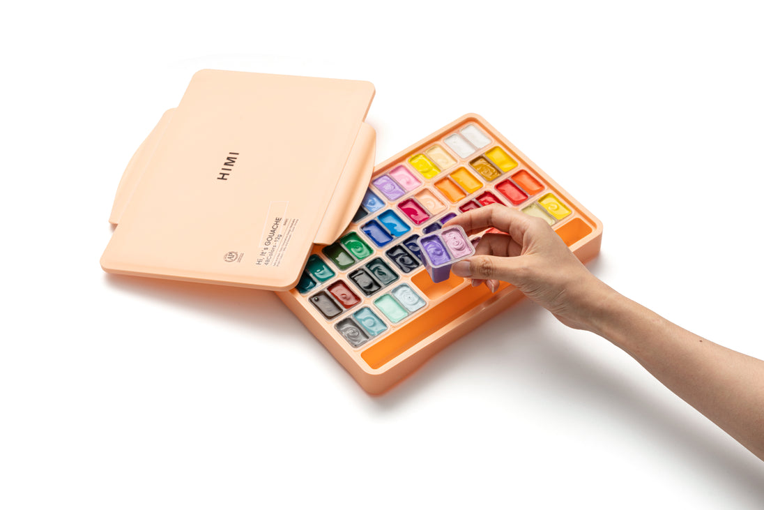 48 vibrant colours in a playful peach fuzz case, opaque gouache paints with 3 handy brushes, ready for beginners and creative explorers alike. Paint without pressure. The HIMI Twin Cup Gouache Set brings together 48 rich colours that stay bright and matte, never chalky or dull. Each colour is made with peach gum and fine pigments for a silky flow and smooth coverage on paper. Gouache reactivates with water, so nothing goes to waste. Just add a drop to bring colours back to life. Easy to clean, safe, and non-toxic, this set is as practical as it is inspiring. Tip: Pair this set with the HIMI Spray to keep paints moist and fresh for longer sessions. The case keeps everything organised and portable, whether you’re painting at home, in class, or on the go. Along with the paints, you’ll find 3 versatile synthetic brushes: round, flat, and filbert in popular everyday sizes, so you can start creating right away. Suitable for artists of every level who want to add colour to their world.