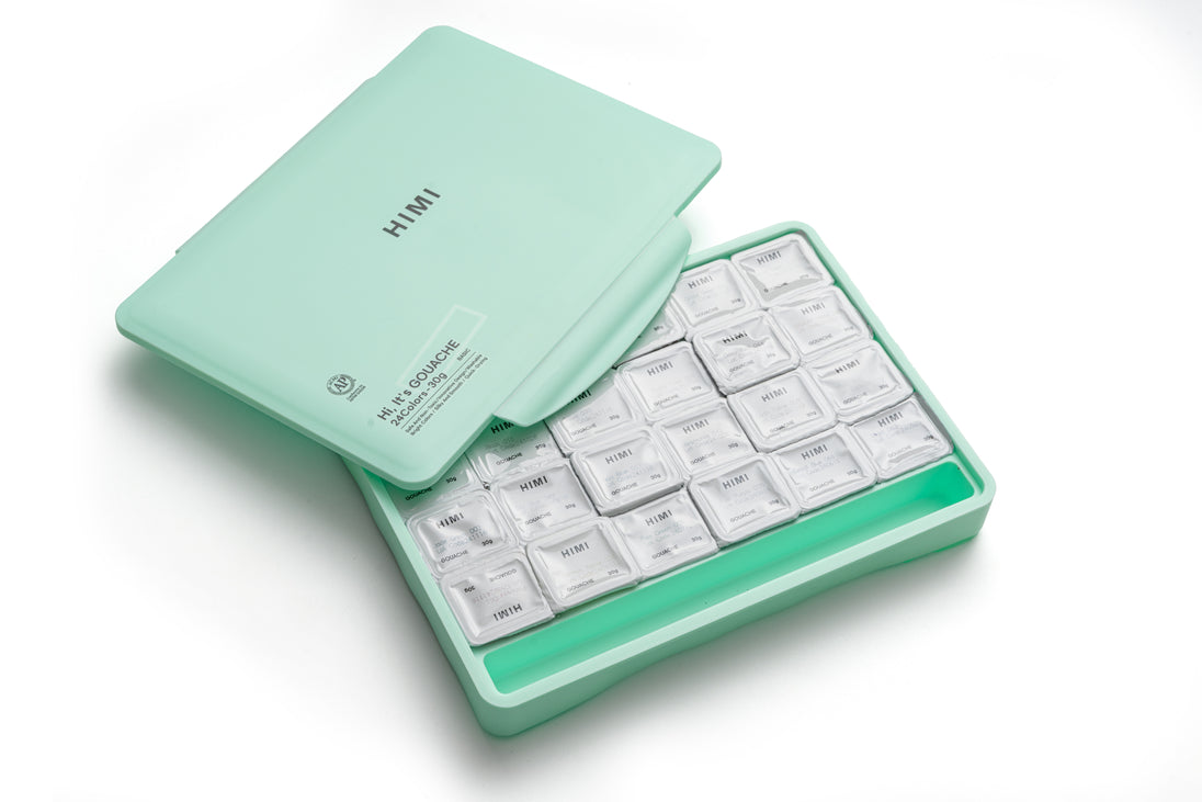 HIMI Jelly Cup Gouache Set 24 Paint Colours, 3 Brushes, Paint Pallete, Green Case, Add Water To Reactivate, Smooth, Rich Colours, Gift, Artist Art Supplies, Large Scale Art Work To Fine Details