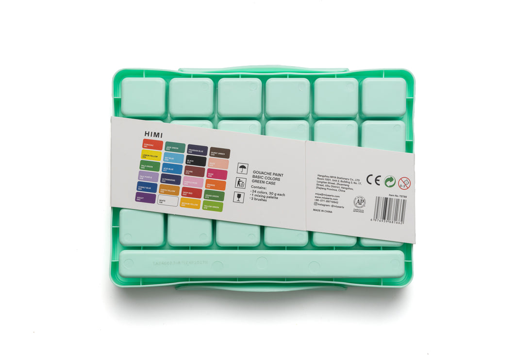 24 basic colours in a green case, opaque gouache paints with 3 handy brushes, ready for beginners and creative explorers alike. Paint without pressure. The HIMI Jelly Cup Gouache Set brings together 24 rich colours that stay bright and matte, never chalky or dull. Each colour is made with peach gum and fine pigments for a silky flow and smooth coverage on paper. Gouache reactivates with water, so nothing goes to waste. Just add a drop to bring colours back to life. Easy to clean, safe, and non-toxic, this set is as practical as it is inspiring. Tip: Pair this set with the HIMI Spray to keep paints moist and fresh for longer sessions. The compact case keeps everything organised and portable, whether you’re painting at home, in class, or on the go. Along with the paints, you’ll find 3 versatile synthetic brushes: round, flat, and filbert in popular everyday sizes, so you can start creating right away. Suitable for artists of every level who want to add colour to their world.