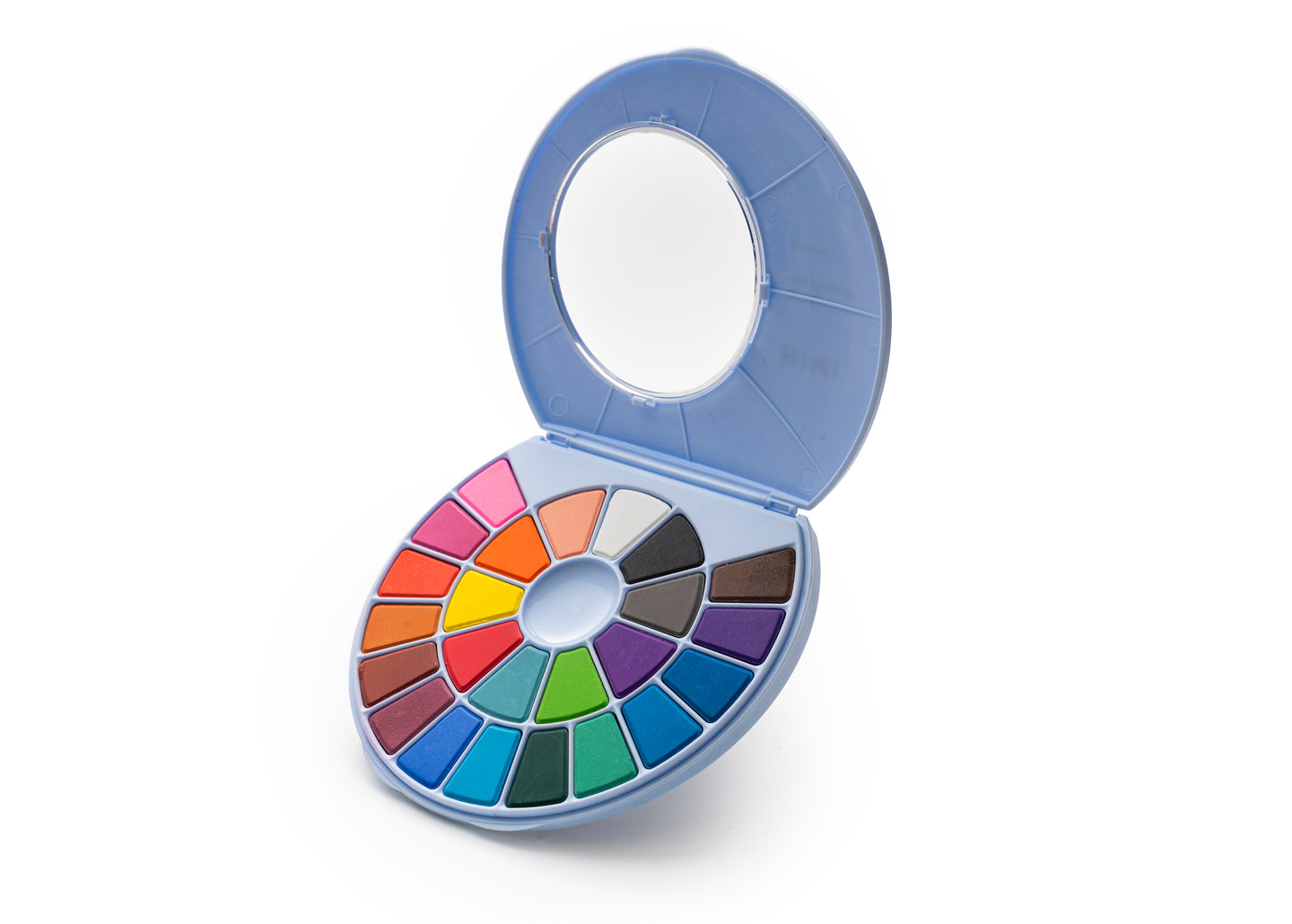 24 bright colours in a blue case, with a free round synthetic brush, perfect for young artists and creative beginners.