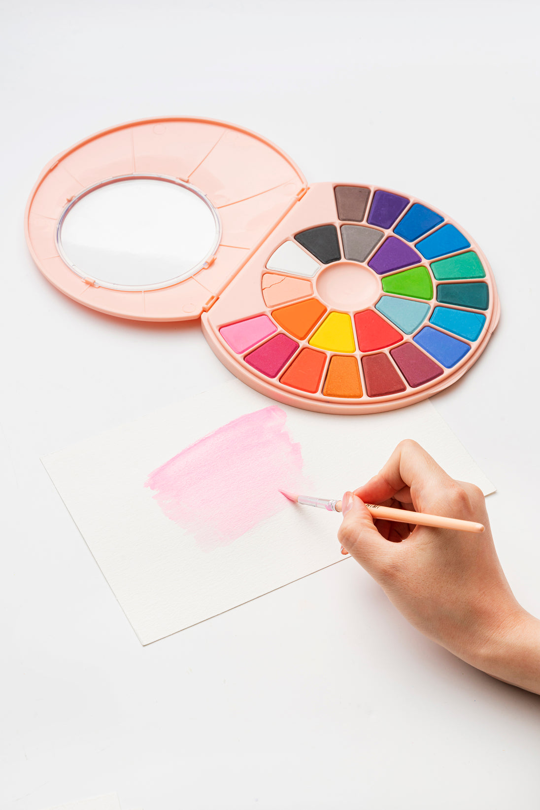 24 bright colours in a pink case, with a free round synthetic brush, perfect for young artists and creative beginners.
