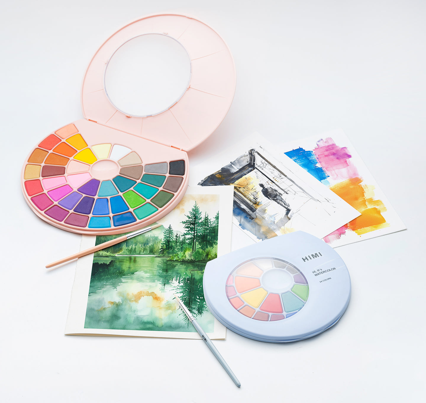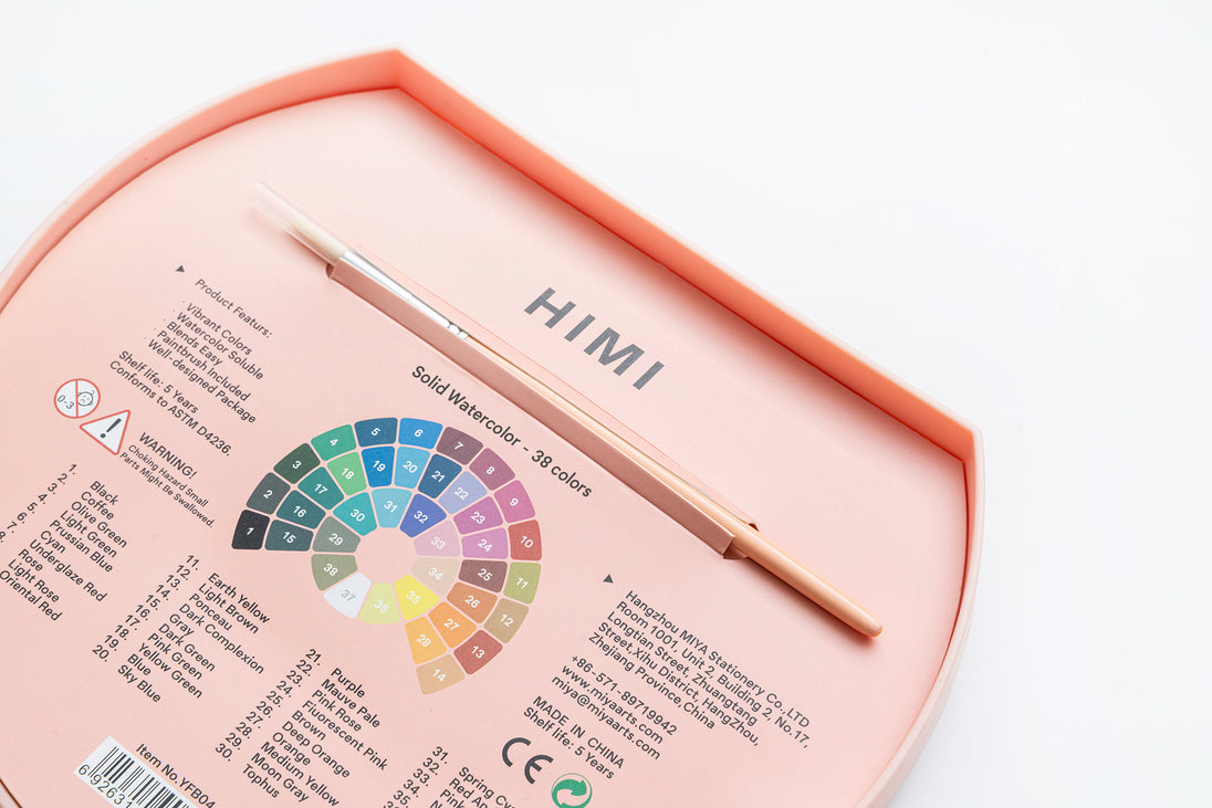 HIMI Solid Watercolour Set 38 Colours In Pans, Brush, Pink Case, Opens Like Makeup Palette, School Art, Teen Sketching, Bold Experiments, Watercolor Supplies Kit, Portable, Beginner Hobby, Gift