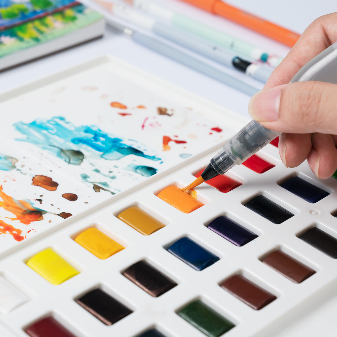 24 studio-quality watercolour shades in a compact plastic case, with a refillable waterbrush and watercolour paper cards, ready for creativity wherever you are.