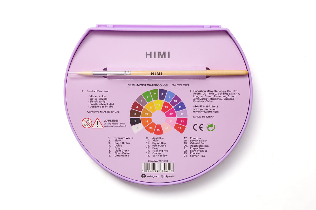 HIMI Semi-Moist Watercolour Set, 24 Colours In Pans, Brush, Purple Case Edition, Softer Than Dry, Wake Up With Splash Of Water, Easy To Mix, Paint Brush, Art Set Supplies, Gift, Beginner
