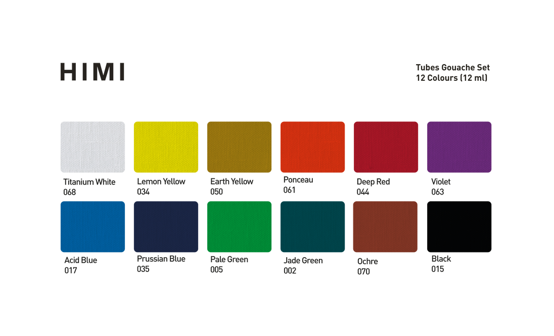 The original HIMI jelly gouache - now in tubes. 12 vibrant colours to start exploring gouache techniques. Experience the famous HIMI jelly gouache, loved for its smooth matte finish and vibrant pigments, now in a classic tube format. The same peach gum and rich pigments ensure silky flow, strong coverage, and colours that stay bright without whitening or dullness. Packed in 12 ml tubes, this version offers a longer shelf life and a more compact design than the original jelly cups: easy to store, take on the go, or use in the classroom. Gouache reactivates with water, so nothing goes to waste. Safe and non-toxic, it also cleans easily from hands and clothes. Perfect as a beginner’s first gouache set, or for anyone who wants the unique HIMI jelly gouache experience in a handy, squeeze-and-go format. Tubes can also be used to refill your HIMI jelly cups when colours run low.