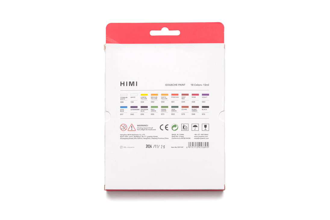The original HIMI jelly gouache - now in tubes. 18 rich colours for creative practice and playful experiments. Experience the famous HIMI jelly gouache, loved for its smooth matte finish and vibrant pigments, now in a classic tube format. The same peach gum and rich pigments ensure silky flow, strong coverage, and colours that stay bright without whitening or dullness. Packed in 12 ml tubes, this version offers a longer shelf life and a more compact design than the original jelly cups: easy to store, take on the go, or use in the classroom. Gouache reactivates with water, so nothing goes to waste. Safe and non-toxic, it also cleans easily from hands and clothes. Perfect as a beginner’s first gouache set, or for anyone who wants the unique HIMI jelly gouache experience in a handy, squeeze-and-go format. Tubes can also be used to refill your HIMI jelly cups when colours run low.