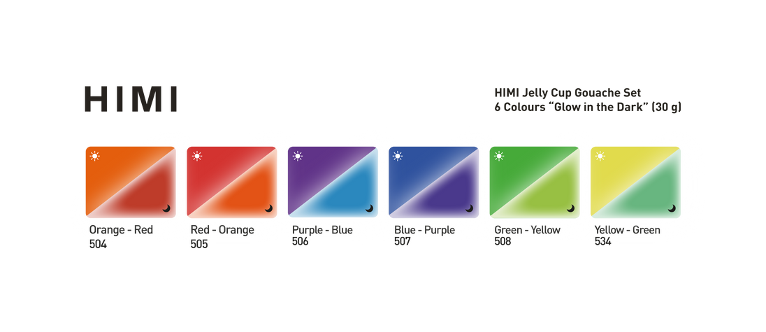 6 glowing colours in a white case, smooth gouache paints that light up your creativity even in the dark. Paint with a glow. The HIMI Jelly Cup Gouache Set – Glow in the Dark Edition features 6 unique luminous shades that absorb light and shine softly when the lights go out. Each colour has the same smooth, creamy HIMI texture made with peach gum and rich pigments, giving you easy coverage and a consistent matte finish. Gouache reactivates with water, so nothing goes to waste. Just add a drop to bring colours back to life. Easy to clean, safe, and non-toxic, this set is as practical as it is inspiring. Tip: Pair this set with the HIMI Spray to keep paints moist and fresh for longer sessions. The compact white case keeps everything neatly organised and portable, whether you’re painting at home, in class, or on the go. Ideal for young artists, students, and anyone who wants to add a playful glow to their creative world.