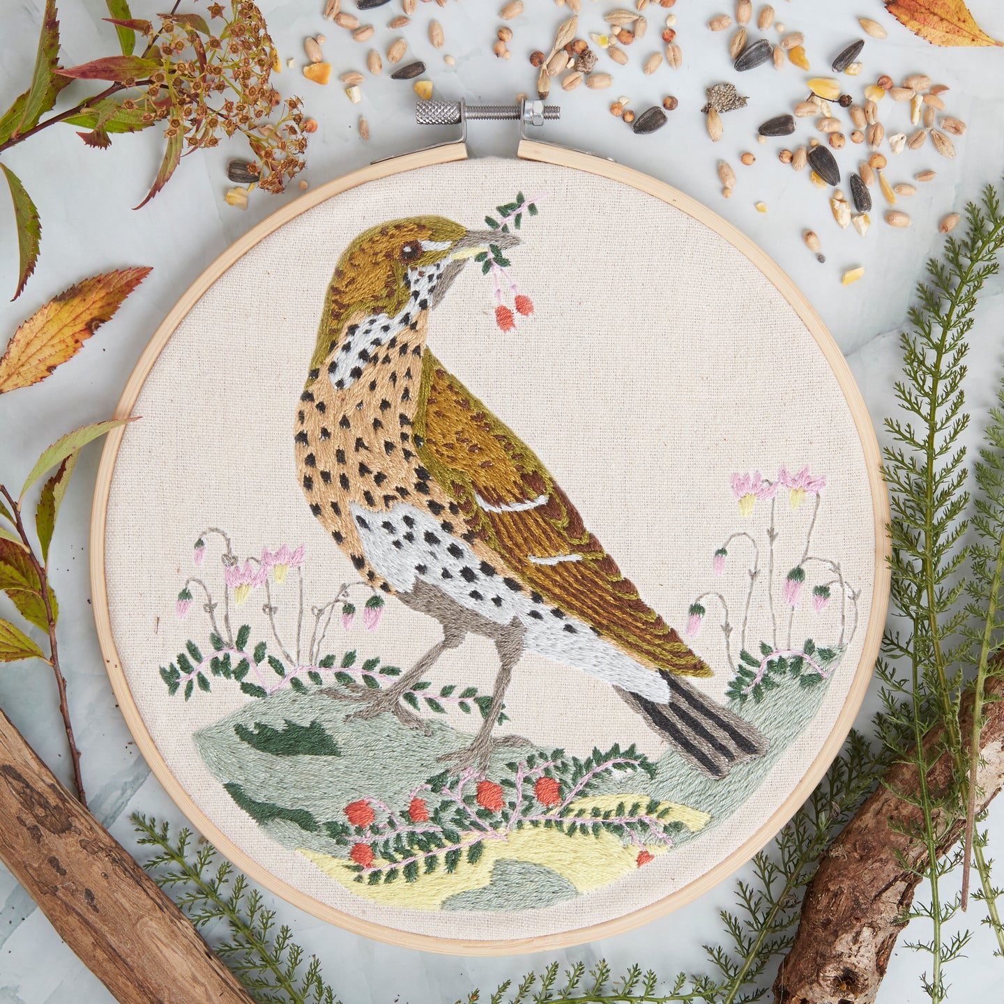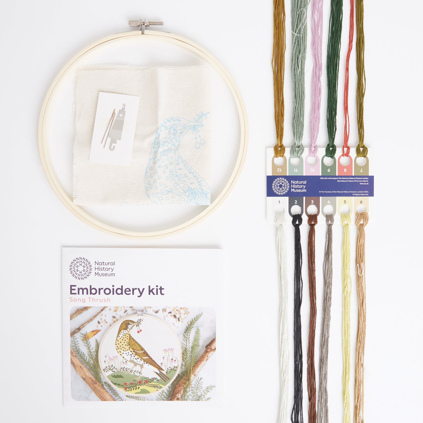 NHM Natural History Museum Embroidery Hoop Decoration Kit, Song Thrush Design, 8", Embroidery Kits For Adults & Cross Stitch Kits for Adults Beginners, Gift Idea, With Embroidery Pattern